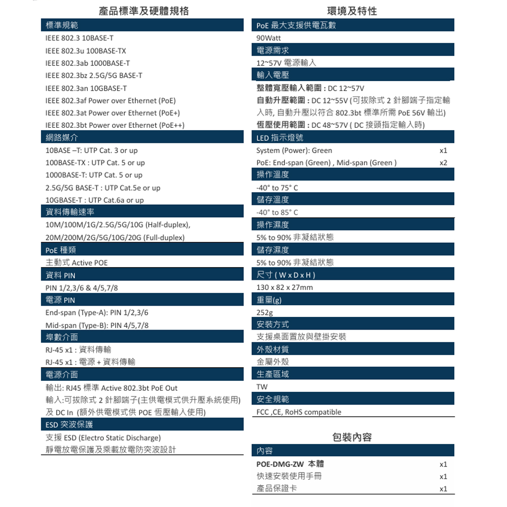 • 符合IEEE 802.3 10Base-T,IEEE 802.3u 100Base-TX,IEEE 802.3ab 1000Base-T,IEEE 802.3bz 2.5G/5G BASE-T, IEEE 802.3an 10GBASE-T,IEEE 802.3af PoE,IEEE 802.3at PoE+ 及 IEEE 802.3bt PoE++等標準規範。