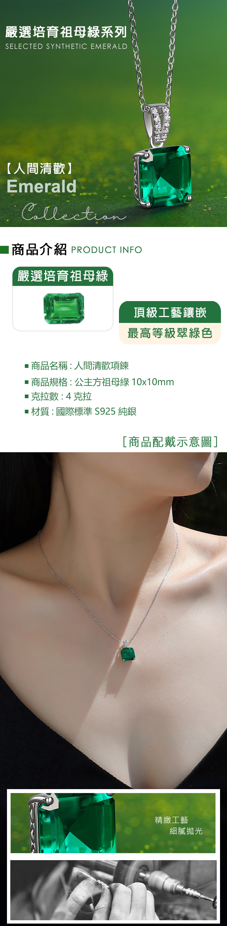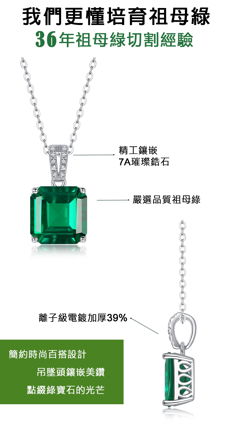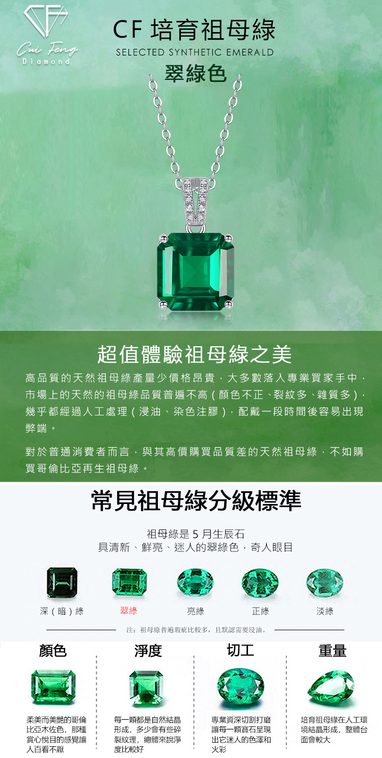 【CF鑽飾|CF Diamond】頂級CF鑽:火彩、亮度、均比鑽石更閃耀、燦爛●主鑽商品:培育祖母綠★材質:國際標準S925純銀,抗過敏,抗氧化★配鑽:7A璀璨方晶●商品標準配備:-附專用拭銀布-原廠精美歐式禮盒、提袋,送禮自用兩相宜【購買注意事項】-因人工測量及於電腦螢幕色差等非人為因素,商品實際尺寸&顏色可能存在微小差異,請以收到實際商品為主!【貼心小提醒】-銀製飾品會因接觸到空氣、汗水氧化時而變黑時,可使用拭銀布擦拭,立即恢復它的光澤亮麗色彩 -請勿浸泡溫泉水及化學藥劑、清潔劑之中 -因拭銀布本身有藥劑,使用完畢後記得洗手!!