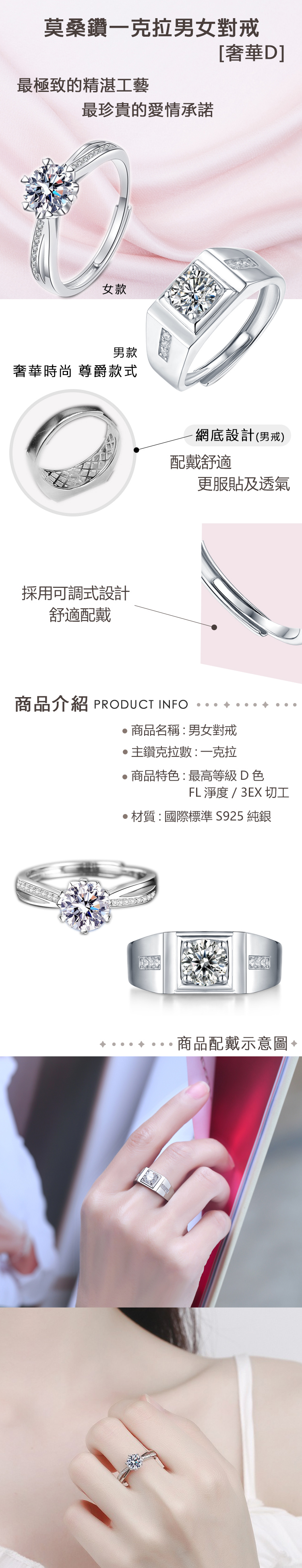 ●商品名稱:《1克拉男女對戒 奢華D》莫桑鑽 純銀 鑽戒●主鑽克拉數(Carat):一克拉●商品特色:最高等級D色 / FL淨度 / 3EX切工★切工:八心八箭邱比特比利時切工,完美切割57個切面,璀璨光芒 ★材質:國際標準S925純銀,抗過敏,抗氧化 ●商品標準配備: -附CF專屬證書-附專用拭銀布 -原廠精美歐式禮盒、提袋,送禮自用兩相宜 【購買注意事項】 -因人工測量及於電腦螢幕色差等非人為因素,商品實際尺寸&顏色可能存在微小差異,請以收到實際商品為主! 【貼心小提醒】 -銀製飾品會因接觸到空氣、汗水氧化時而變黑時,可使用拭銀布擦拭,立即恢復它的光澤亮麗色彩 -請勿浸泡溫泉水及化學藥劑、清潔劑之中 -因拭銀布本身有藥劑,使用完畢後記得洗手!!