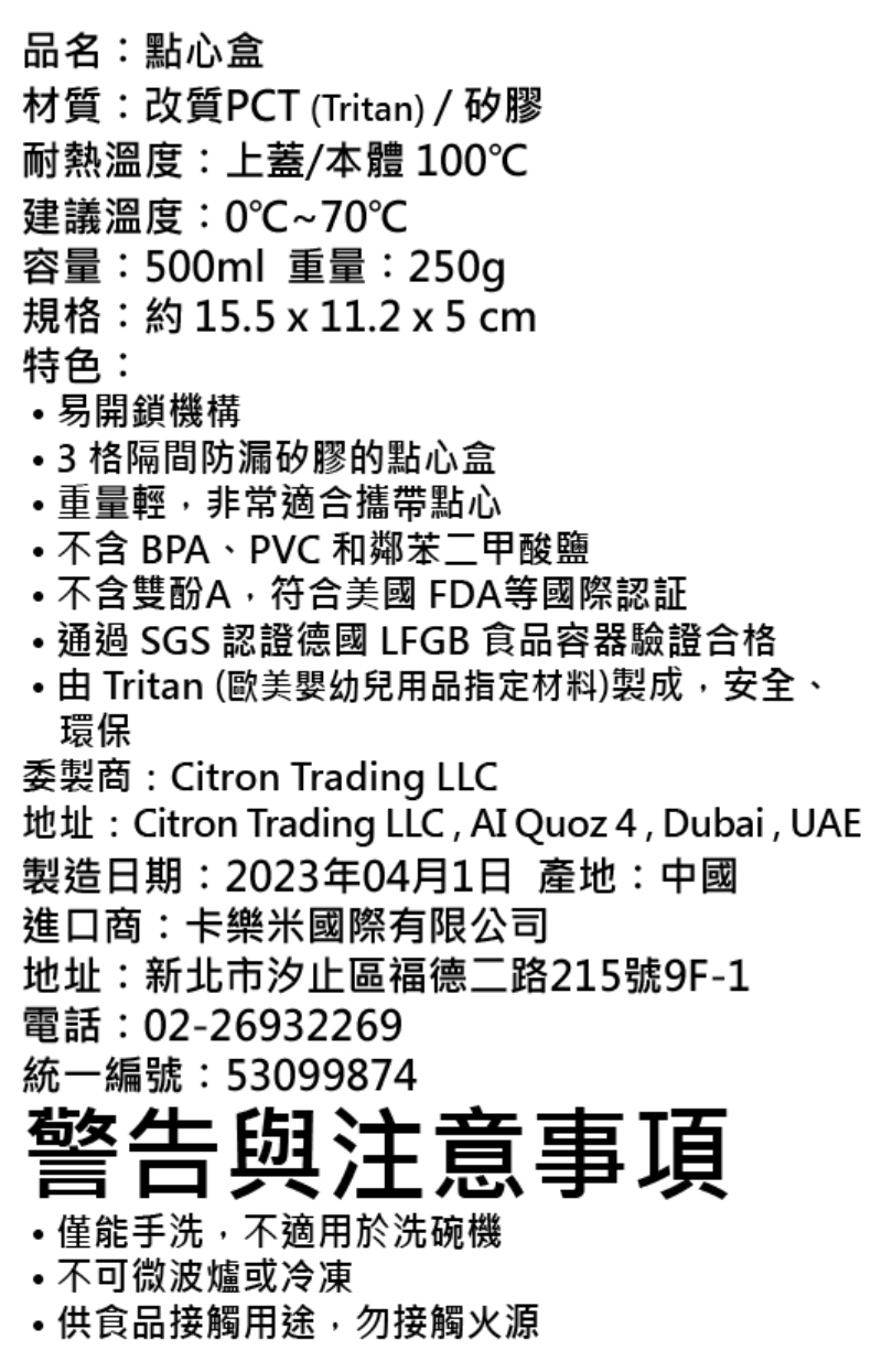 ✔通過SGS 認證德國LFGB食品容器驗證合格✔由 Tritan (歐美嬰幼兒用品指定材料)製成,安全、環保✔3 格隔間防漏矽膠的點心盒✔可拆式矽膠條方便清洗✔輕便容易攜帶✔易開鎖機構✔不含雙酚A,符合美國FDA等國際認証