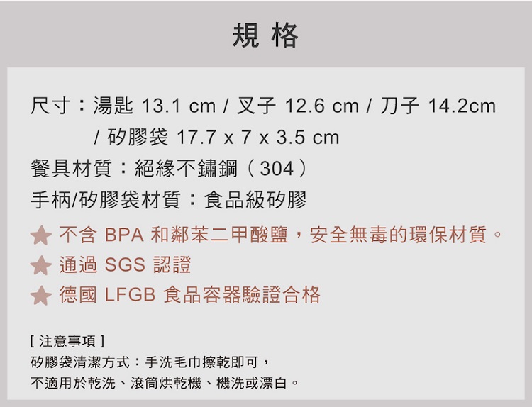 ✔通過SGS 認證德國LFGB食品容器驗證合格✔餐具由絕緣不鏽鋼 (304)製成✔小尺寸及矽膠手柄, 安全且適合小手抓握✔可堆疊設計,方便攜帶✔多功能矽膠袋由食品級矽膠製成✔尺寸耐髒好清潔並適用於各種物品收納✔不含 BPA 和鄰苯二甲酸鹽的材料可確保您的安全以及環保材質製成✔餐具可適用於洗碗機✔多功能矽膠袋清潔方式:手洗毛巾擦乾即可✔多功能矽膠袋不適用於乾洗、滾筒烘乾機、機洗或漂白