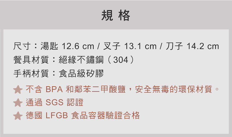 ✔通過SGS 認證德國LFGB食品容器驗證合格✔餐具由絕緣不銹鋼 (304)製成✔小尺寸及矽膠手柄, 安全且適合小手抓握✔可堆疊設計,方便攜帶✔不含 BPA 和鄰苯二甲酸鹽的材料可確保您的安全以及環保材質製成✔餐具可適用於洗碗機
