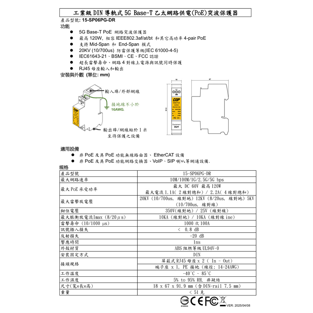 昌運監視器 工業級DIN導軌式5G Base-T乙太網路供電(PoE)突波保護器