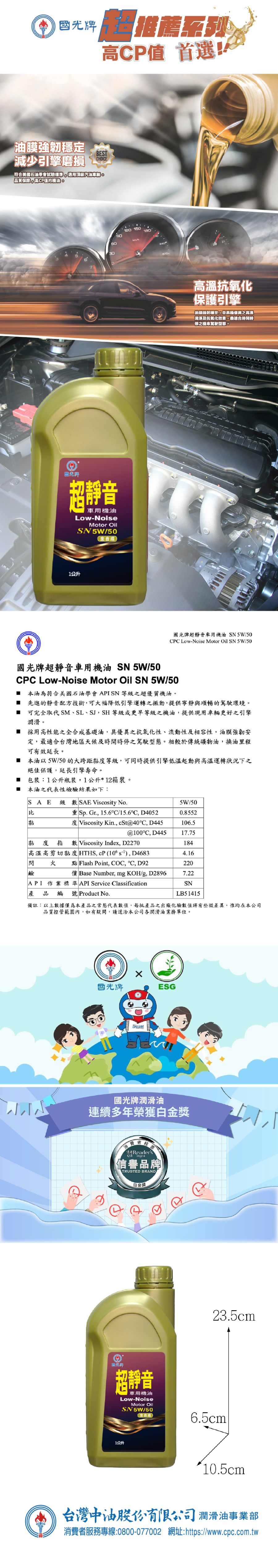 產品名稱:超靜音車用機油SN 5W50 1L