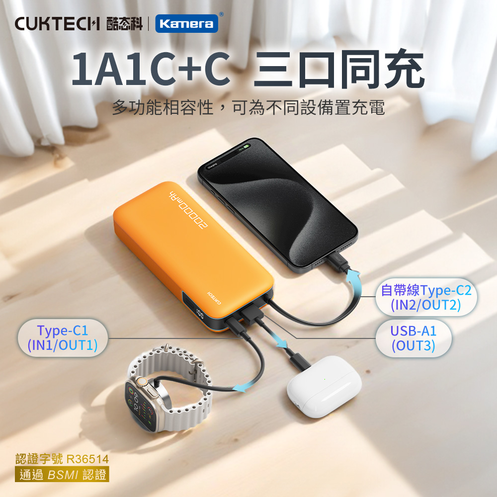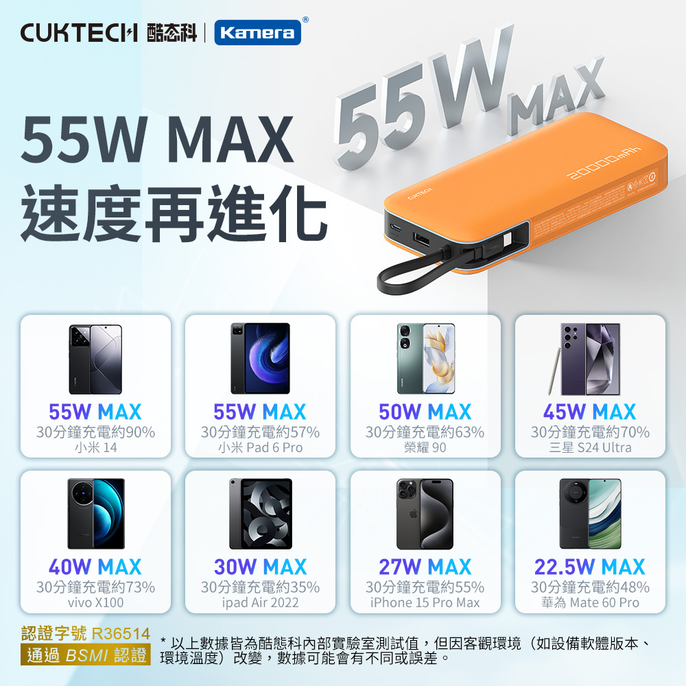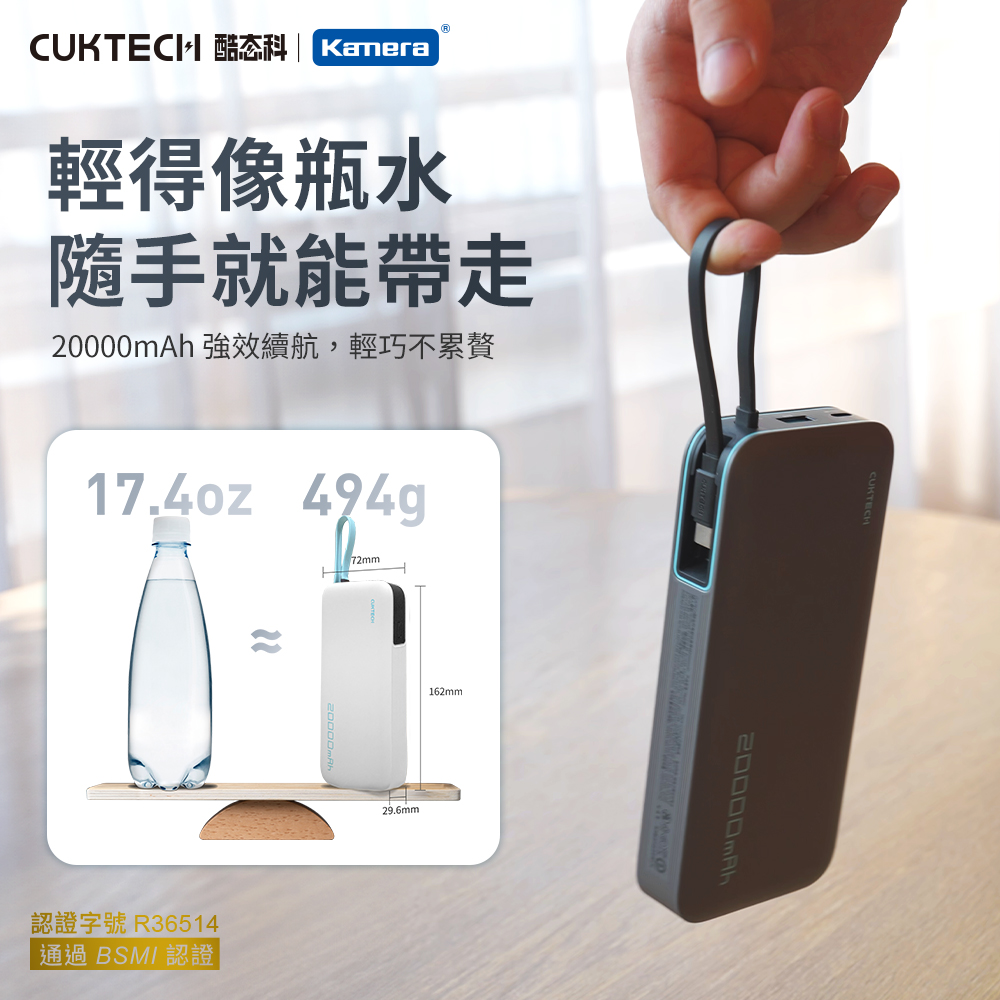 產品特點● 自帶Type-C雙向快充線:一條線搞定充放電,出門不怕忘記带線,隨手即用方便又省事。● 55W高效快充,筆電也能補電:支援最高55W PD快充,可為筆電丶iPad丶Switch等設備快速充電。相較常見20W/30W行動電源,效能大升級。● 超大容量20000mAh:可為手機充電3~5次以上,週末旅遊丶商務出差安心續航,滿足學生、上班族丶旅遊族不同場景的續航需求。● 智慧安全保護,使用更安心:多重安全防護設計,過充丶過放丶短路等完整防護,適用搭飛機(符合航空攜帶標準),符合旅遊族需求。● 精緻收納設計,輕鬆抽拉不卡卡:插槽式收線,拉出即用,收回俐落,適合追求美感與效率的用戶,設計簡約不花俏,更能符合對於科技感與實用性並重的審美。