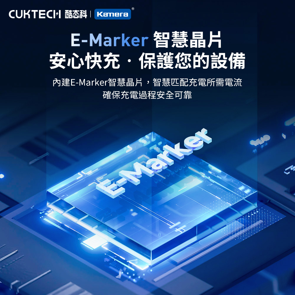 ● 內置E-Marker智能芯片,提供穩定的電流輸出,防止過充、過熱和短路,確保每一次充電都安全無憂。