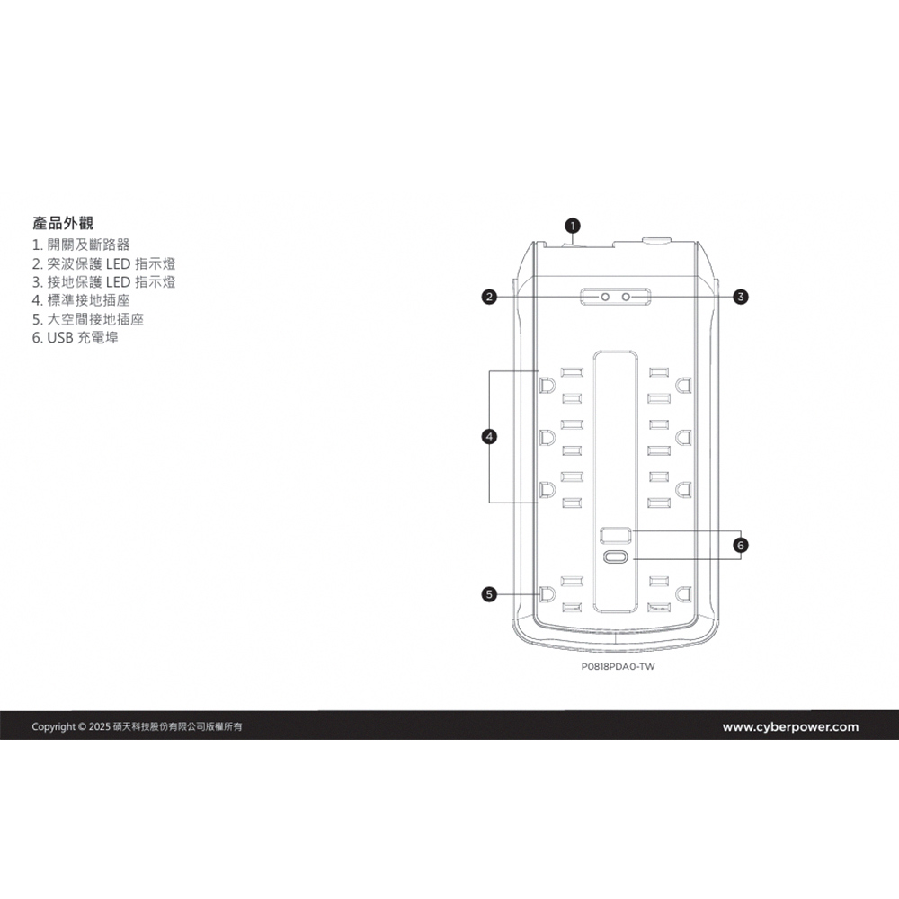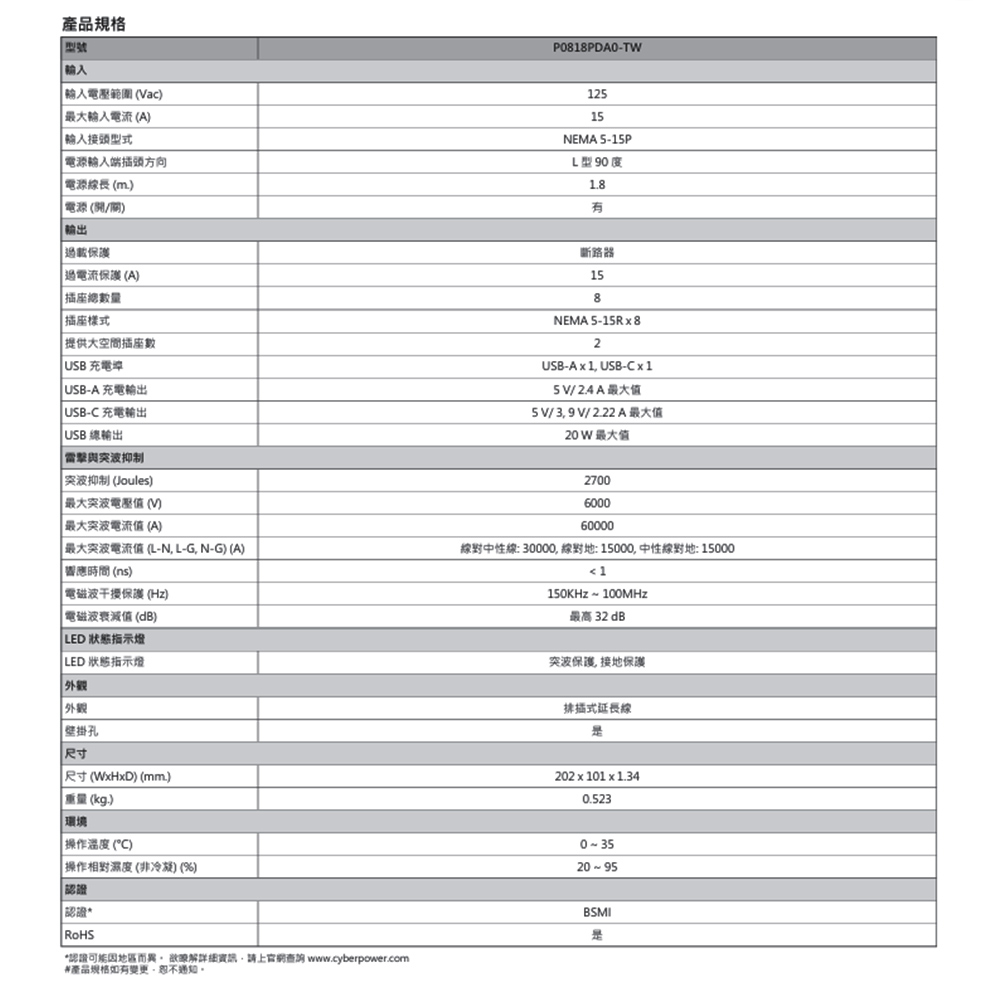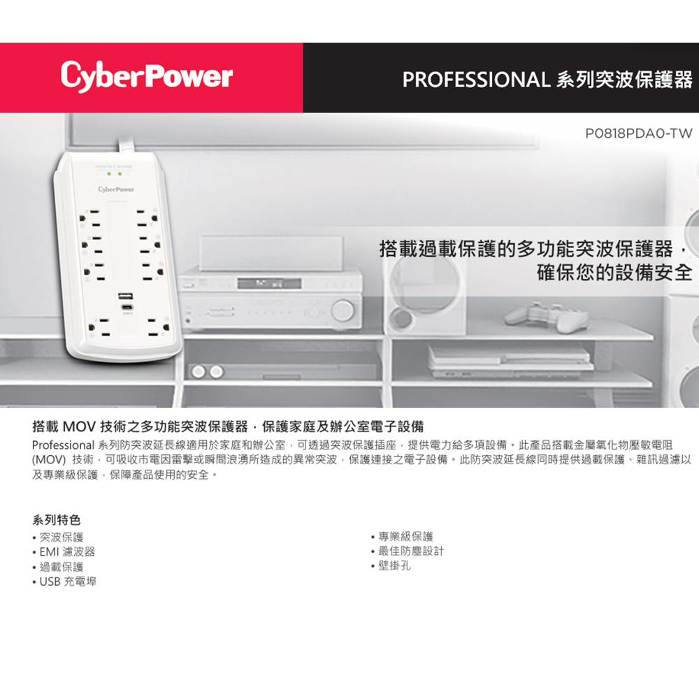 -CyberPower P0818PDA0-TW 適用於家庭及辦公室設備之突波保護。此突波保護器搭載金屬氧化物壓敏電阻 (MOV) 技術,可吸收市電因雷擊或瞬間浪湧所造成的異常突波,保護連接之電子設備。