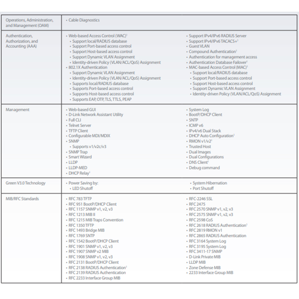 -Compact CLI、Web UI、SNMPv1/v2c/v3、Syslog管理機制、LLDP、LLDP-MED。