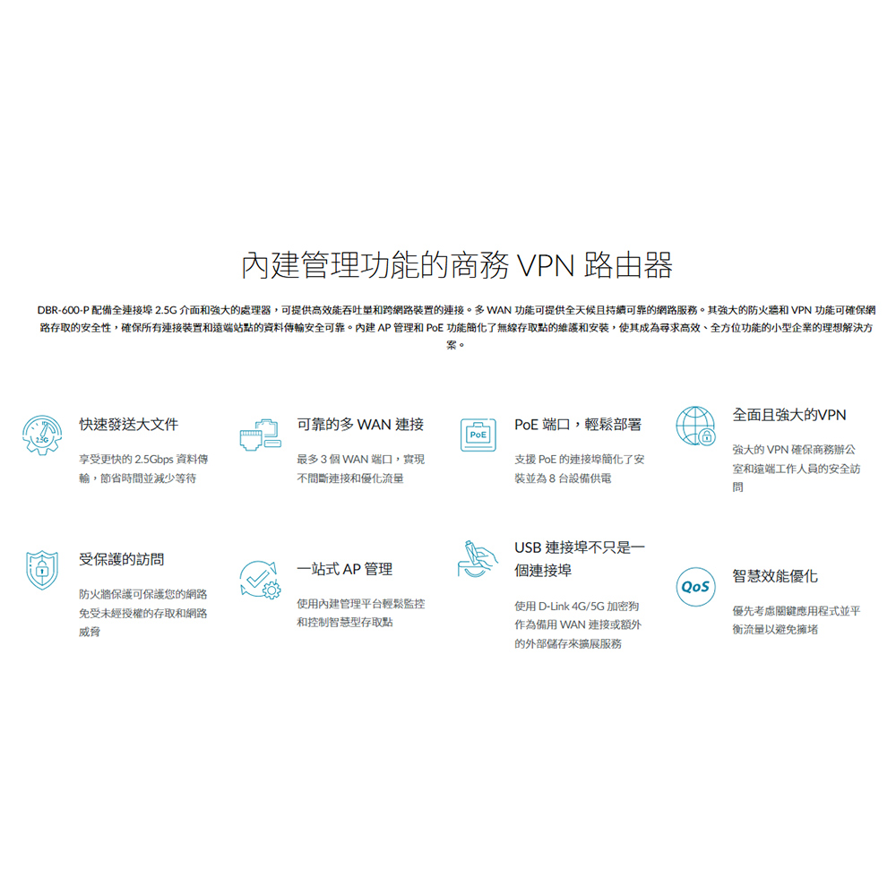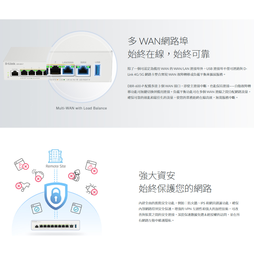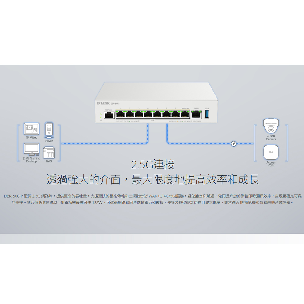 -DBR-600-P配備全連接埠2.5G介面和強大的處理器,可提供高效能吞吐量和跨網路裝置的連接。