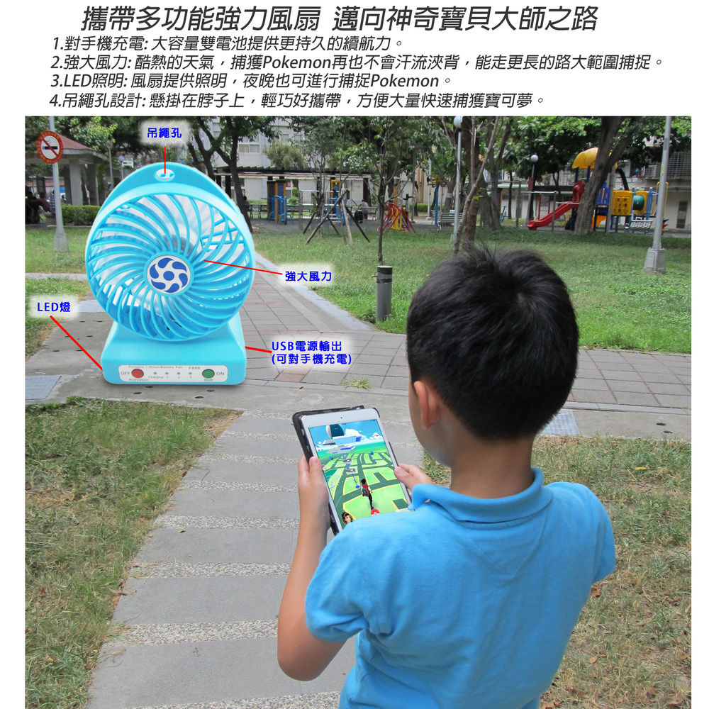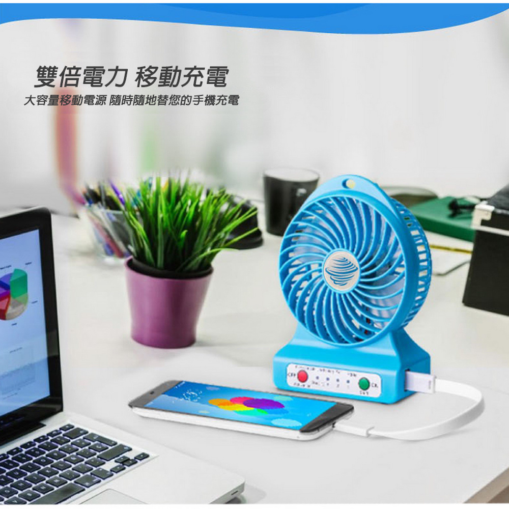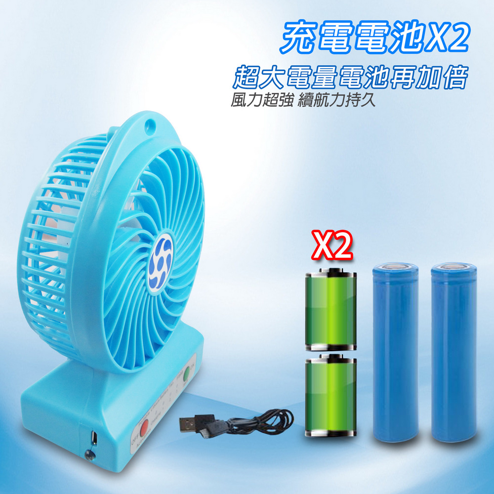 《商品介紹》送大容量鋰電池x2+充電線+吊繩四大好禮風速加倍,雙電池電量再加倍夏日居家或郊遊外出的最佳良伴超強風力,3段變速可充電式風扇雙電池設計,使用時間更長馬達再精進,風速再加倍強力風扇+手機充電+LED照明+吊繩四大功能戶外活動的好涼伴輕巧好攜帶,酷夏降溫神器綠色環保,清涼消暑四角緊密保護防撞,減緩碰撞衝擊雙電池設計,使用時間更長馬達再精進,風速再加倍強力風扇+手機充電+LED燈+吊繩 四大功能超強馬達馬力,轉速極快,提供強大風力風扇有三段轉速調節:弱中強可USB供電,也可由鋰電池供電輕巧好攜帶,可以手持或座立可以一邊充電,一邊享受風扇的涼爽使用一般USB +5V供電使用方便,操作簡單外出時,可以緊急對手機充電夜晚時,可以打開LED燈照明時尚設計,有吊繩孔,可吊掛或架立可拆卸式電池,隨時可更換電池居家辦公,外出郊遊都適宜本產品雖已設計多項安全防護,仍然建議未成年的兒童,需有家長陪伴使用!!!使用本產品時,請勿讓幼兒拿的到或玩耍,以免造成危險!!!