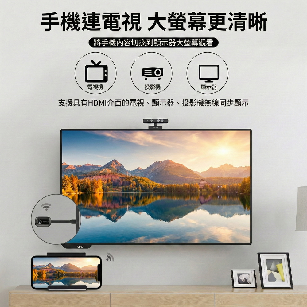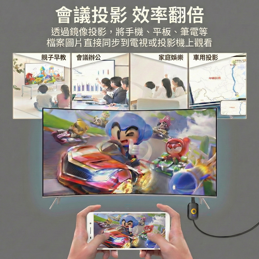 《商品特色》隨時隨地 大螢幕娛樂操作簡單 影音投影■一機多用,教學/娛樂/導航全搞定■免安裝任何軟體■無線連結,影音同步分享■支援蘋果/安卓/電腦無線投影顯示■可電腦直接電視同步顯示■高畫質輸出,高速穩定傳輸《商品介紹》隨著智慧型裝置普及,手機、平板、電腦已成為日常不可或缺的工具。但螢幕太小往往影響學習與娛樂體驗。現在,只要一個 無線投影器,就能輕鬆將螢幕畫面同步到電視或投影機,大螢幕享受更清晰、更震撼!隨插即投:操作簡單,免驅動免APP。跨平台支援:支援 iOS / Android / Windows / Mac OS。高畫質輸出:清晰畫質 ,清晰不卡頓。穩定傳輸:低延遲設計,影音同步。輕巧便攜:出差、上課、居家,一機搞定。【應用場景】居家娛樂:追劇、看電影,大螢幕更沉浸。遊戲對戰:手機秒變遊戲主機,刺激加倍。教育教學:課堂同步投影,互動更生動。會議簡報:商務展示更專業,告別繁瑣連線。汽車導航:手機地圖投影到大螢幕,安全又直觀。《注意事項》1.如果要使用在汽車的螢幕投影,請先確認汽車是否有HDMI或AV影音輸入,請確認後再進行購買。2. 本商品是HDMI影音傳輸介面,如果是汽車是AV(黃白紅三色插孔)則需要另外自行準備HDMI轉AV的轉換器才可以使用。《商品配備》無線影音鏡像傳輸器 x1USB充電器 x1說明書 x1《商品規格》廠牌: Dawise型號: 10代WD06顏色: 黑支援的設備: 蘋果,安卓,微軟裝置支援影音同步傳輸模式: AirPlay/Miracast/DLNA/WIDIUSB供電(DC+5V)HDMI連接介面產地: 中國產品保固: 主機保固3個月,配件/贈品保固1個月,保固範圍不包含人為損壞。《注意事項:》產品顏色可能會因為相機拍照色偏因素而有差異,請以實際出貨為準。《NCC認證字號》 CCAJ15LP0250T3
