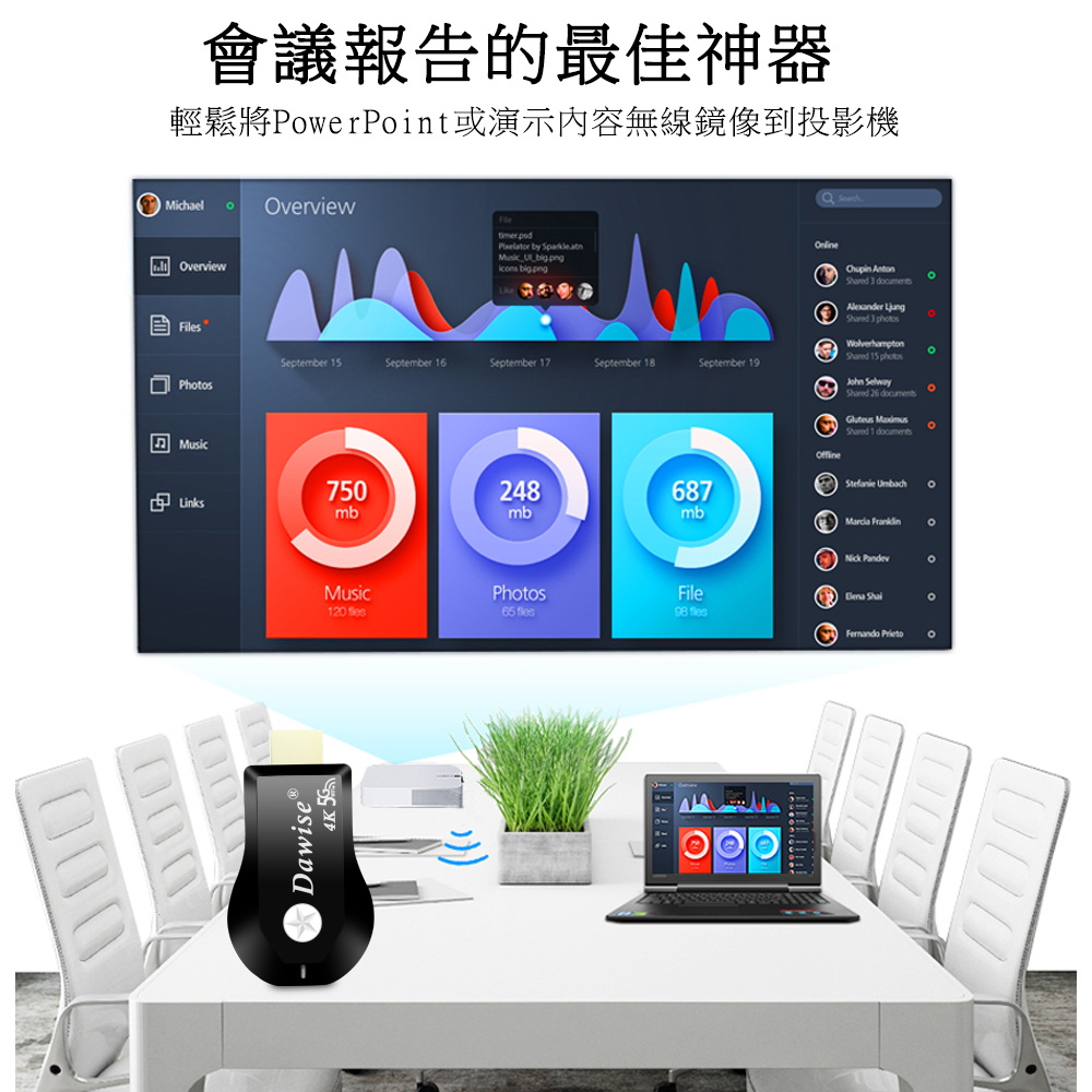 《商品特色》真正高畫質無線影音傳輸支持H.265高畫質無線投影操作簡單 影音投影■支援4K(3840×2160)超高清畫質■免安裝任何軟體■無線連結,影音同步分享■支援蘋果/安卓/電腦無線投影顯示■可電腦直接電視同步顯示■支持Airplay/Miracast/WIDI/DLNA影音同步傳輸模式《商品介紹》隨著智慧型裝置普及,手機、平板、電腦已成為日常不可或缺的工具。但螢幕太小往往影響學習與娛樂體驗。現在,只要一個 無線投影器,就能輕鬆將螢幕畫面同步到電視或投影機,大螢幕享受更清晰、更震撼!隨插即投:操作簡單,免驅動免APP。跨平台支援:支援 iOS / Android / Windows / Mac OS。高畫質輸出:清晰畫質 ,清晰不卡頓。穩定傳輸:低延遲設計,影音同步。輕巧便攜:出差、上課、居家,一機搞定。【應用場景】居家娛樂:追劇、看電影,大螢幕更沉浸。遊戲對戰:手機秒變遊戲主機,刺激加倍。教育教學:課堂同步投影,互動更生動。會議簡報:商務展示更專業,告別繁瑣連線。汽車導航:手機地圖投影到大螢幕,安全又直觀。《注意事項》1.如果要使用在汽車的螢幕投影,請先確認汽車是否有HDMI或AV影音輸入,請確認後再進行購買。2. 本商品是HDMI影音傳輸介面,如果是汽車是AV(黃白紅三色插孔)則需要另外自行準備HDMI轉AV的轉換器才可以使用。《商品配備》無線影音鏡像傳輸器 x1WiFi模組線x1說明書 x14大好禮: USB充電器x1 + HDMI傳輸線x1 + HDMI母對母轉接頭x1 + 手機支架x1《商品規格》廠牌: Dawise型號: 第十代WD67顏色: 黑支援的設備: 蘋果,安卓,微軟裝置支援影音同步傳輸模式: AirPlay/Miracast/DLNA/WIDIUSB供電(DC+5V)HDMI連接電視產地: 中國大陸產品保固: 主機保固3個月,配件/贈品保固1個月,保固範圍不包含人為損壞。《NCC認證字號》CCAJ14LP398GT9