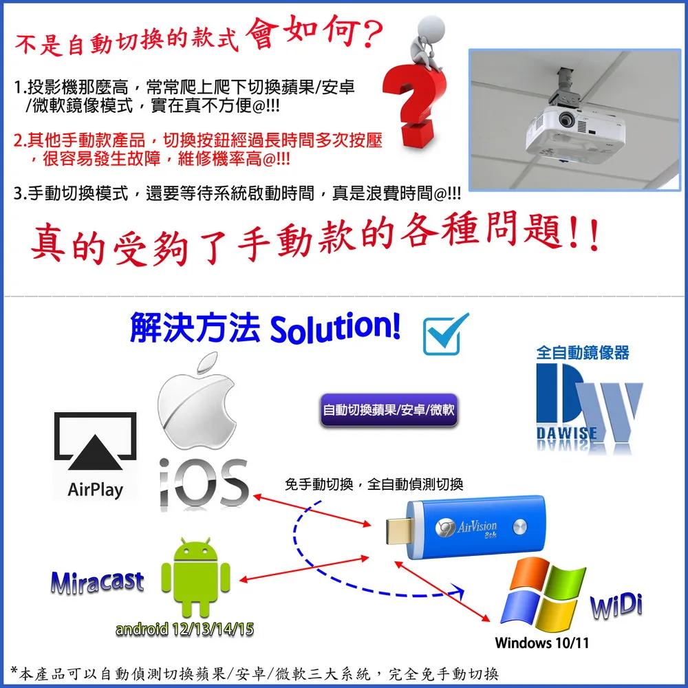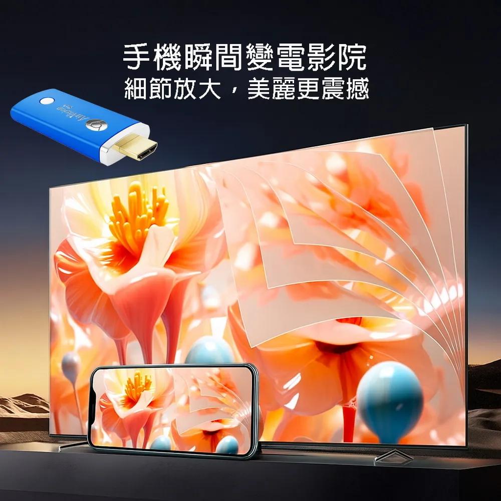 隨時隨地大螢幕娛樂操作簡單影音投影一機多用,教學娛樂導航全搞定免安裝任何軟體無線連結,影音同步分享支援蘋果/安卓/電腦無線投影可電腦直接電視同步顯示高畫質輸出,高速穩定傳輸《商品介紹》隨著智慧型裝置普及,手機、平板、電腦已成為日常不可或缺的工具。但螢幕太小往往影響學習與娛樂體驗。現在,只要一個 無線投影器,就能輕鬆將螢幕畫面同步到電視或投影機,大螢幕享受更清晰、更震撼!隨插即投:操作簡單,免驅動免APP。跨平台支援:支援 iOS / Android / Windows / Mac OS。高畫質輸出:支援 Full HD ,清晰不卡頓。穩定傳輸:低延遲設計,影音同步。輕巧便攜:出差、上課、居家,一機搞定。【應用場景】居家娛樂:追劇、看電影,大螢幕更沉浸。遊戲對戰:手機秒變遊戲主機,刺激加倍。教育教學:課堂同步投影,互動更生動。會議簡報:商務展示更專業,告別繁瑣連線。汽車導航:手機地圖投影到大螢幕,安全又直觀。《注意事項》1.如果要使用在汽車的螢幕投影,請先確認汽車是否有HDMI或AV影音輸入,請確認後再進行購買。2. 本商品是HDMI影音傳輸介面,如果是汽車是AV(黃白紅三色插孔)則需要另外自行準備HDMI轉AV的轉換器才可以使用。《商品配備》無線影音鏡像傳輸器 x1說明書 x14大好禮: USB充電器x1 + USB供電線x1 + HDMI延長線x1 + (手機支架x1 或 指環扣x1 兩款隨機出貨其中一款)《商品規格》廠牌: Dawise型號: 八代WD39顏色: 藍支援的設備: 蘋果,安卓,微軟裝置支援影音同步傳輸模式: AirPlay/Miracast/DLNA/WIDIUSB供電(DC+5V)HDMI連接電視產地: 中國產品保固: 主機保固3個月,配件/贈品保固1個月,保固範圍不包含人為損壞。《注意事項:》產品顏色可能會因為相機拍照色偏因素而有差異,請以實際出貨為準。《NCC認證字號》 CCAJ15LP0827T6
