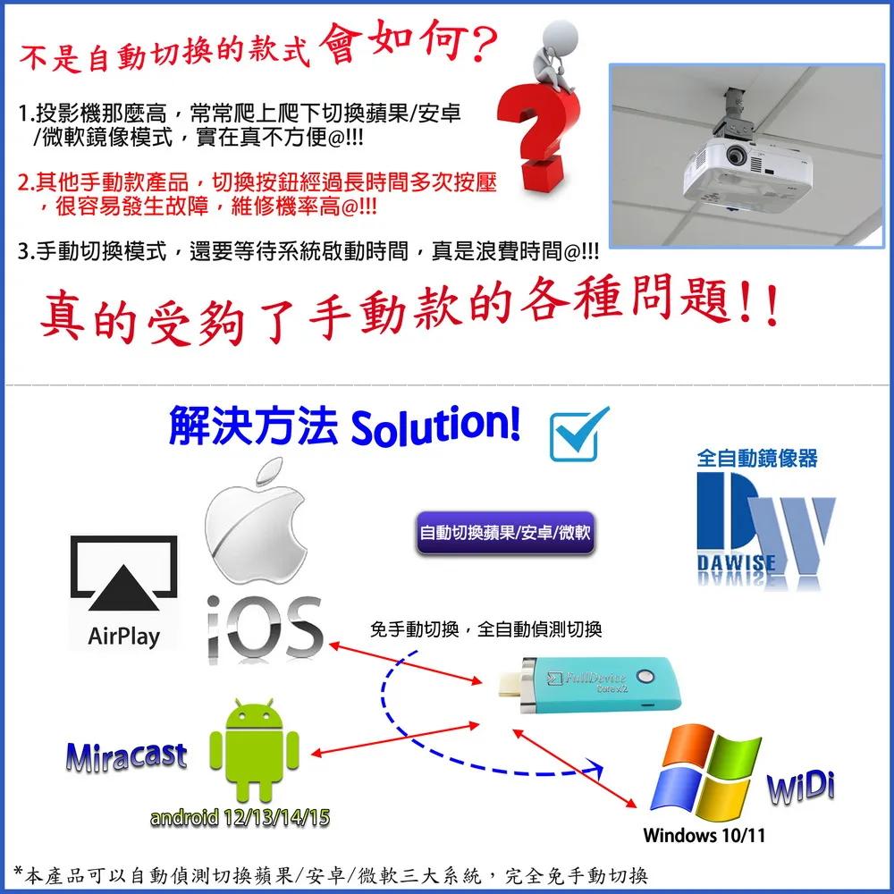 隨時隨地大螢幕娛樂操作簡單影音投影一機多用,教學娛樂導航全搞定免安裝任何軟體無線連結,影音同步分享支援蘋果/安卓/電腦無線投影可電腦直接電視同步顯示高畫質輸出,高速穩定傳輸《商品介紹》隨著智慧型裝置普及,手機、平板、電腦已成為日常不可或缺的工具。但螢幕太小往往影響學習與娛樂體驗。現在,只要一個 無線投影器,就能輕鬆將螢幕畫面同步到電視或投影機,大螢幕享受更清晰、更震撼!隨插即投:操作簡單,免驅動免APP。跨平台支援:支援 iOS / Android / Windows / Mac OS。高畫質輸出:支援 Full HD ,清晰不卡頓。穩定傳輸:低延遲設計,影音同步。輕巧便攜:出差、上課、居家,一機搞定。【應用場景】居家娛樂:追劇、看電影,大螢幕更沉浸。遊戲對戰:手機秒變遊戲主機,刺激加倍。教育教學:課堂同步投影,互動更生動。會議簡報:商務展示更專業,告別繁瑣連線。汽車導航:手機地圖投影到大螢幕,安全又直觀。《注意事項》1.如果要使用在汽車的螢幕投影,請先確認汽車是否有HDMI或AV影音輸入,請確認後再進行購買。2. 本商品是HDMI影音傳輸介面,如果是汽車是AV(黃白紅三色插孔)則需要另外自行準備HDMI轉AV的轉換器才可以使用。《商品配備》無線影音鏡像傳輸器 x1說明書 x14大好禮: USB充電器x1 + USB供電線x1 + HDMI延長線x1 + (手機支架x1 或 指環扣x1 兩款隨機出貨其中一款)《商品規格》廠牌: Dawise型號: 八代WD37顏色: 青色支援的設備: 蘋果,安卓,微軟裝置支援影音同步傳輸模式: AirPlay/Miracast/DLNA/WIDIUSB供電(DC+5V)HDMI連接電視產地: 中國產品保固: 主機保固3個月,配件/贈品保固1個月,保固範圍不包含人為損壞。《注意事項:》產品顏色可能會因為相機拍照色偏因素而有差異,請以實際出貨為準。《NCC認證字號》 CCAJ15LP0825T2
