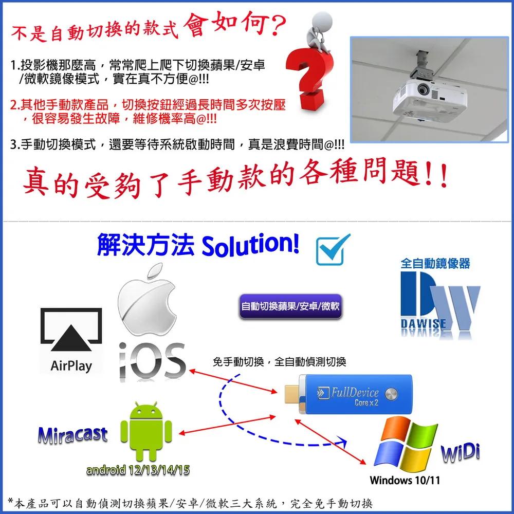 隨時隨地大螢幕娛樂操作簡單影音投影一機多用,教學娛樂導航全搞定免安裝任何軟體無線連結,影音同步分享支援蘋果/安卓/電腦無線投影可電腦直接電視同步顯示高畫質輸出,高速穩定傳輸《商品介紹》隨著智慧型裝置普及,手機、平板、電腦已成為日常不可或缺的工具。但螢幕太小往往影響學習與娛樂體驗。現在,只要一個 無線投影器,就能輕鬆將螢幕畫面同步到電視或投影機,大螢幕享受更清晰、更震撼!隨插即投:操作簡單,免驅動免APP。跨平台支援:支援 iOS / Android / Windows / Mac OS。高畫質輸出:支援 Full HD ,清晰不卡頓。穩定傳輸:低延遲設計,影音同步。輕巧便攜:出差、上課、居家,一機搞定。【應用場景】居家娛樂:追劇、看電影,大螢幕更沉浸。遊戲對戰:手機秒變遊戲主機,刺激加倍。教育教學:課堂同步投影,互動更生動。會議簡報:商務展示更專業,告別繁瑣連線。汽車導航:手機地圖投影到大螢幕,安全又直觀。《注意事項》1.如果要使用在汽車的螢幕投影,請先確認汽車是否有HDMI或AV影音輸入,請確認後再進行購買。2. 本商品是HDMI影音傳輸介面,如果是汽車是AV(黃白紅三色插孔)則需要另外自行準備HDMI轉AV的轉換器才可以使用。《商品配備》無線影音鏡像傳輸器 x1說明書 x14大好禮: USB充電器x1 + USB供電線x1 + HDMI延長線x1 + (手機支架x1 或 指環扣x1 兩款隨機出貨其中一款)《商品規格》廠牌: Dawise型號: 八代WD37顏色: 藍支援的設備: 蘋果,安卓,微軟裝置支援影音同步傳輸模式: AirPlay/Miracast/DLNA/WIDIUSB供電(DC+5V)HDMI連接電視產地: 中國產品保固: 主機保固3個月,配件/贈品保固1個月,保固範圍不包含人為損壞。《注意事項:》產品顏色可能會因為相機拍照色偏因素而有差異,請以實際出貨為準。《NCC認證字號》 CCAJ15LP0825T2