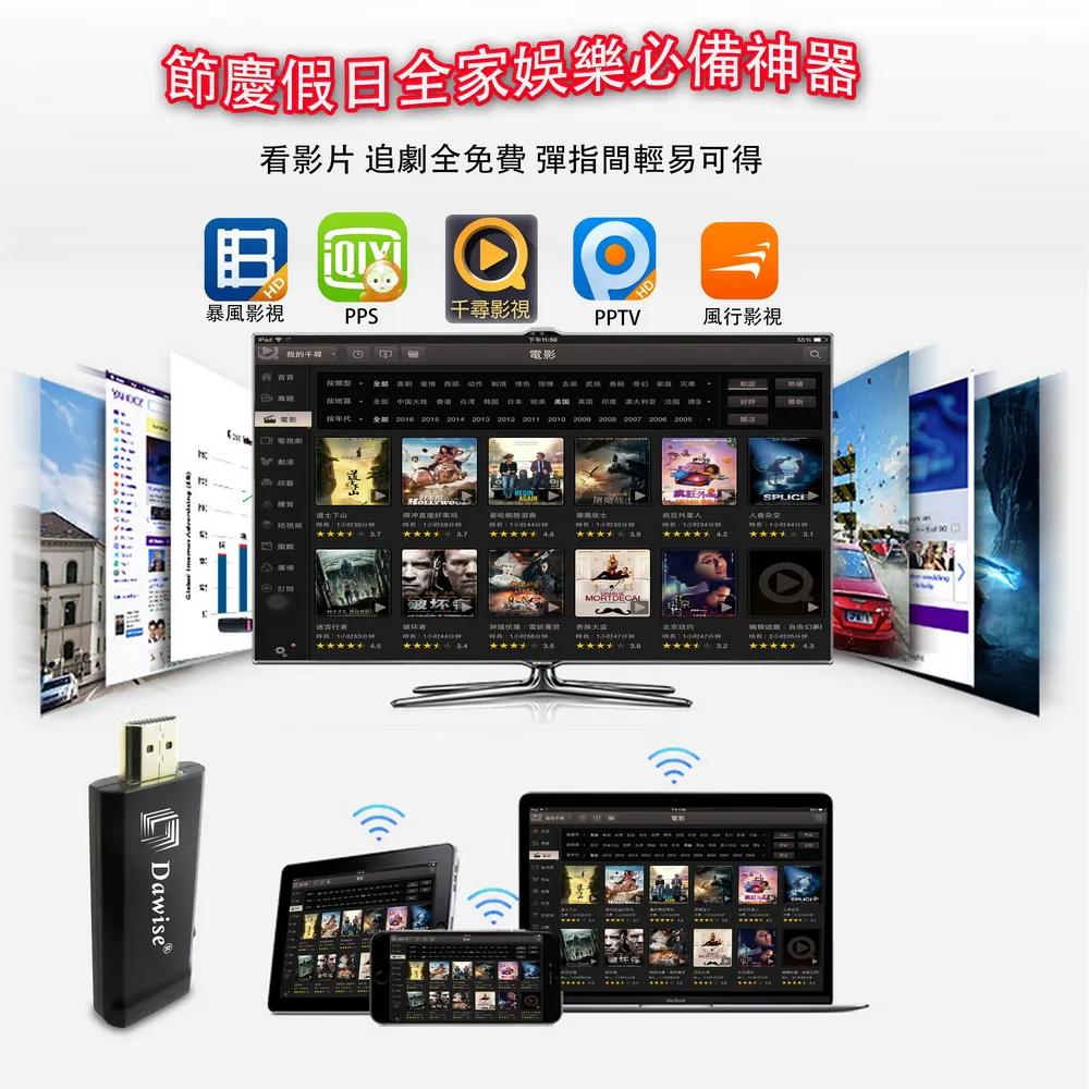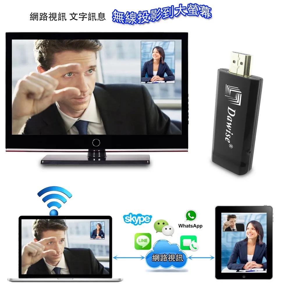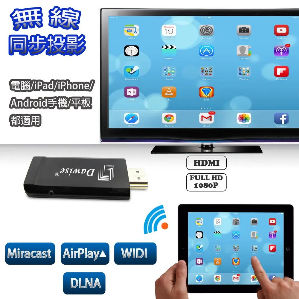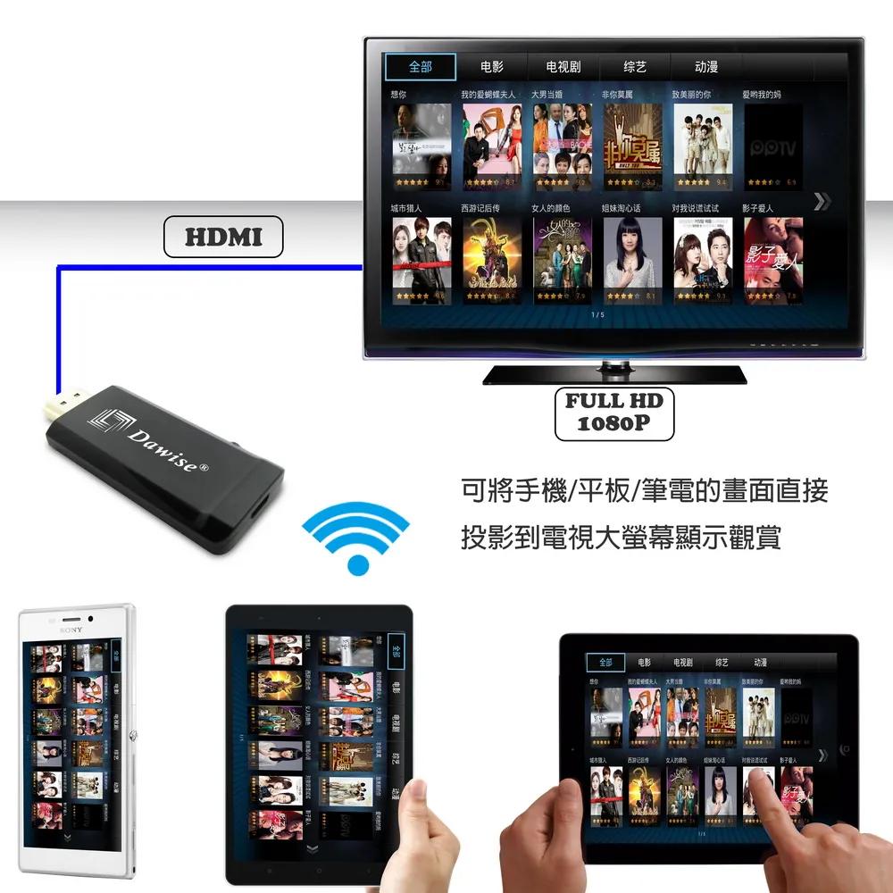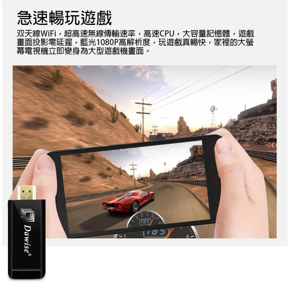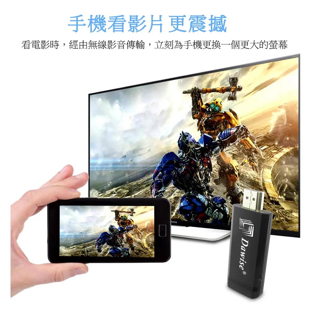 隨時隨地大螢幕娛樂操作簡單影音投影一機多用,教學娛樂導航全搞定免安裝任何軟體無線連結,影音同步分享支援蘋果/安卓/電腦無線投影可電腦直接電視同步顯示高畫質輸出,高速穩定傳輸《商品介紹》隨著智慧型裝置普及,手機、平板、電腦已成為日常不可或缺的工具。但螢幕太小往往影響學習與娛樂體驗。現在,只要一個 無線投影器,就能輕鬆將螢幕畫面同步到電視或投影機,大螢幕享受更清晰、更震撼!隨插即投:操作簡單,免驅動免APP。跨平台支援:支援 iOS / Android / Windows / Mac OS。高畫質輸出:支援 Full HD ,清晰不卡頓。穩定傳輸:低延遲設計,影音同步。輕巧便攜:出差、上課、居家,一機搞定。【應用場景】居家娛樂:追劇、看電影,大螢幕更沉浸。遊戲對戰:手機秒變遊戲主機,刺激加倍。教育教學:課堂同步投影,互動更生動。會議簡報:商務展示更專業,告別繁瑣連線。汽車導航:手機地圖投影到大螢幕,安全又直觀。《注意事項》1.如果要使用在汽車的螢幕投影,請先確認汽車是否有HDMI或AV影音輸入,請確認後再進行購買。2. 本商品是HDMI影音傳輸介面,如果是汽車是AV(黃白紅三色插孔)則需要另外自行準備HDMI轉AV的轉換器才可以使用。《商品配備》無線影音鏡像傳輸器 x1WiFi模組線x1說明書 x14大好禮: USB充電器x1 + HDMI傳輸線x1 + HDMI母對母轉接頭x1 + 手機支架x1《商品規格》廠牌: Dawise型號: 七代WD26顏色: 黑支援的設備: 蘋果,安卓,微軟裝置支援影音同步傳輸模式: AirPlay/Miracast/DLNA/WIDIUSB供電(DC+5V)HDMI連接電視產地: 中國大陸產品保固: 主機保固3個月,配件/贈品保固1個月,保固範圍不包含人為損壞。《NCC認證字號》CCAJ15LP3111T4