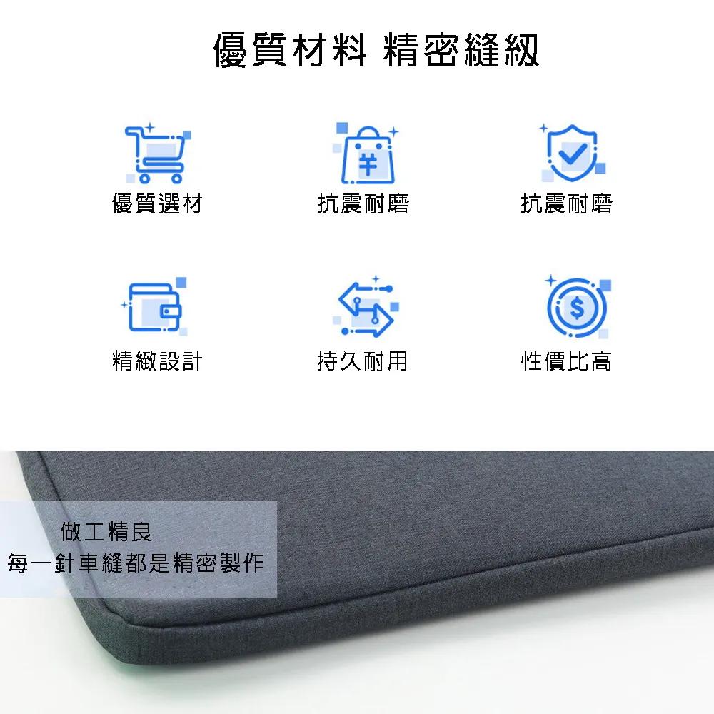《商品介紹》輕輕呵護您的平板及筆電精緻輕薄,方便好攜帶■簡約精湛的設計■多重保護,防撞防污損■適用各種便攜式裝置設備■ 經久耐用,柔軟內襯,防震減壓1.可置放ipad/Mac/平板/筆電/手機,可當內襯包使用,加強保護。2.精緻美感,防護平板/筆電刮傷或碰撞。3.兼具防震緩衝、柔軟彈性等特點,手感細膩,舒軟,讓您的筆電/平板受到最好的保護。4.輕巧簡約便利攜帶5.防塵防撞,保護設備不受損《注意事項》請確認您的平板或筆電的長寬尺寸,再進行購買適當尺寸的保護包11吋 尺寸規格(長x寬): 31.5 x 22 (cm)13吋 尺寸規格(長x寬): 34 x 24 (cm)14吋 尺寸規格(長x寬): 36.5 x 26 (cm)15.6吋 尺寸規格(長x寬): 39.5 x 29 (cm)