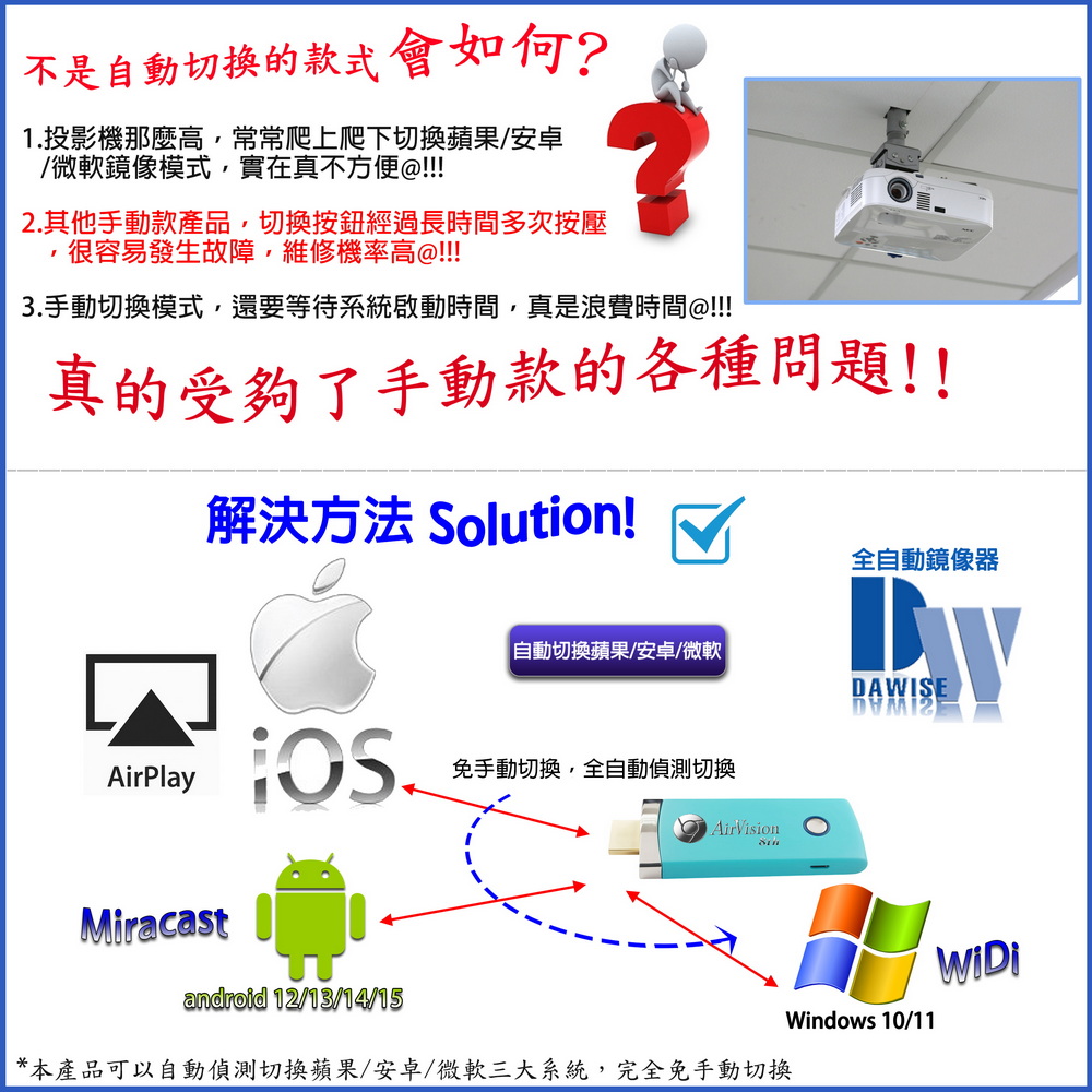 隨時隨地大螢幕娛樂操作簡單影音投影一機多用,教學娛樂導航全搞定免安裝任何軟體無線連結,影音同步分享支援蘋果/安卓/電腦無線投影可電腦直接電視同步顯示高畫質輸出,高速穩定傳輸《商品介紹》隨著智慧型裝置普及,手機、平板、電腦已成為日常不可或缺的工具。但螢幕太小往往影響學習與娛樂體驗。現在,只要一個 無線投影器,就能輕鬆將螢幕畫面同步到電視或投影機,大螢幕享受更清晰、更震撼!隨插即投:操作簡單,免驅動免APP。跨平台支援:支援 iOS / Android / Windows / Mac OS。高畫質輸出:支援 Full HD ,清晰不卡頓。穩定傳輸:低延遲設計,影音同步。輕巧便攜:出差、上課、居家,一機搞定。【應用場景】居家娛樂:追劇、看電影,大螢幕更沉浸。遊戲對戰:手機秒變遊戲主機,刺激加倍。教育教學:課堂同步投影,互動更生動。會議簡報:商務展示更專業,告別繁瑣連線。汽車導航:手機地圖投影到大螢幕,安全又直觀。《注意事項》1.如果要使用在汽車的螢幕投影,請先確認汽車是否有HDMI或AV影音輸入,請確認後再進行購買。2. 本商品是HDMI影音傳輸介面,如果是汽車是AV(黃白紅三色插孔)則需要另外自行準備HDMI轉AV的轉換器才可以使用。《商品配備》無線影音鏡像傳輸器 x1說明書 x14大好禮: USB充電器x1 + USB供電線x1 + HDMI延長線x1 + (手機支架x1 或 指環扣x1 兩款隨機出貨其中一款)《商品規格》廠牌: Dawise型號: 八代WD39顏色: 青翠色支援的設備: 蘋果,安卓,微軟裝置支援影音同步傳輸模式: AirPlay/Miracast/DLNA/WIDIUSB供電(DC+5V)HDMI連接電視產地: 中國產品保固: 主機保固3個月,配件/贈品保固1個月,保固範圍不包含人為損壞。《注意事項:》產品顏色可能會因為相機拍照色偏因素而有差異,請以實際出貨為準。《NCC認證字號》 CCAJ15LP0827T6