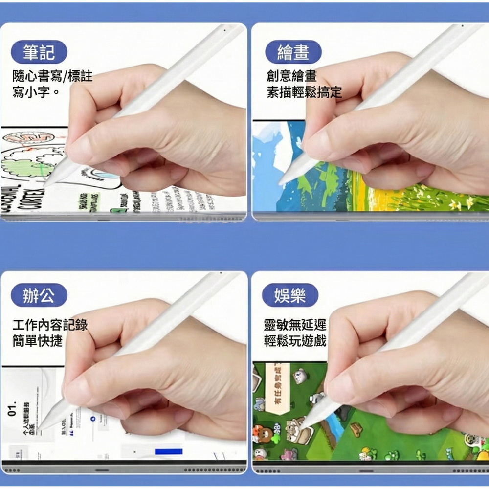 《商品介紹》攜帶方便,隨意書寫想畫就畫,想寫就寫免裝軟體,無需藍芽配對■書寫/塗鴉/繪圖最佳利器■順滑好書寫■好握好寫,攜帶方便■內建鋰電池充電設計■方便隨身攜帶1. 精密耐用纖維觸控筆頭,穩定/耐用/實用。2. 操作快速簡易,隨拿即用3. 不需搭配APP或是藍芽使用。4. 觸控位置精準,書寫非常流暢5. 本商品不是”蘋果Apple Pencil”,也與”蘋果Apple Pencil”功能不同,請確認後再購買。《注意事項》這是iPad專用觸控筆,只適用ipad及ipad mini,請先確認後再購買