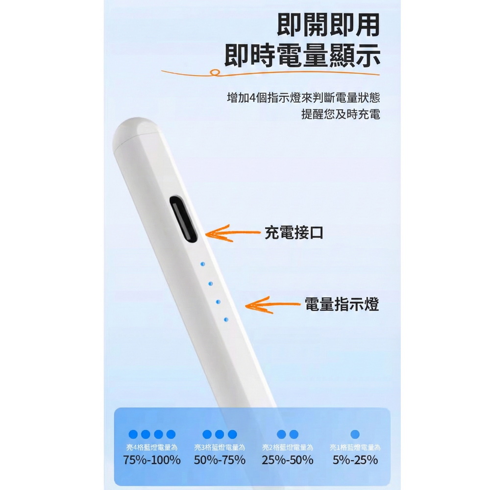 《商品介紹》攜帶方便,隨意書寫想畫就畫,想寫就寫免裝軟體,無需藍芽配對■書寫/塗鴉/繪圖最佳利器■順滑好書寫■好握好寫,攜帶方便■內建鋰電池充電設計■方便隨身攜帶1. 精密耐用纖維觸控筆頭,穩定/耐用/實用。2. 操作快速簡易,隨拿即用3. 不需搭配APP或是藍芽使用。4. 觸控位置精準,書寫非常流暢5. 本商品不是”蘋果Apple Pencil”,也與”蘋果Apple Pencil”功能不同,請確認後再購買。《注意事項》這是iPad專用觸控筆,只適用ipad及ipad mini,請先確認後再購買