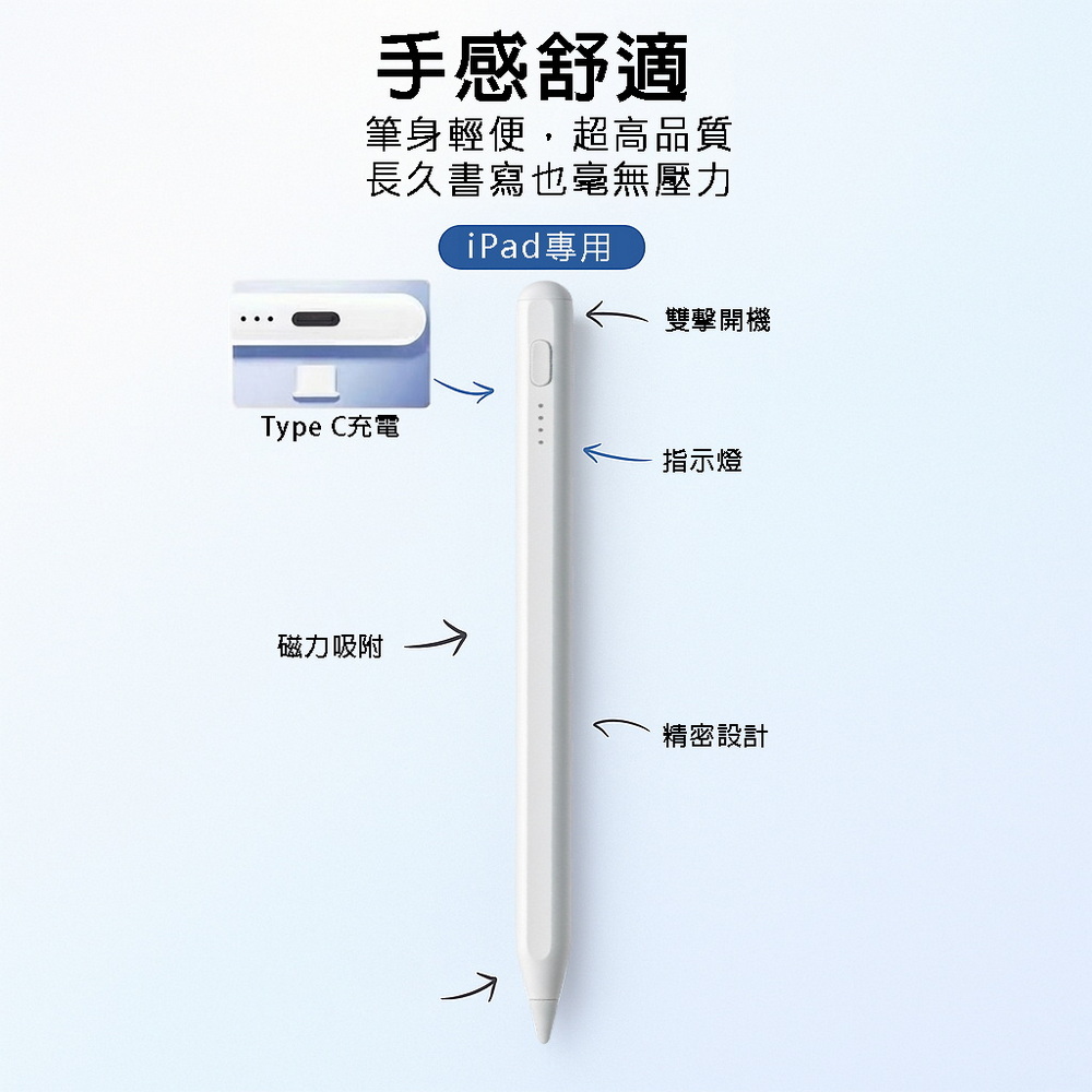 《商品介紹》攜帶方便,隨意書寫想畫就畫,想寫就寫免裝軟體,無需藍芽配對■書寫/塗鴉/繪圖最佳利器■順滑好書寫■好握好寫,攜帶方便■內建鋰電池充電設計■方便隨身攜帶1. 精密耐用纖維觸控筆頭,穩定/耐用/實用。2. 操作快速簡易,隨拿即用3. 不需搭配APP或是藍芽使用。4. 觸控位置精準,書寫非常流暢5. 本商品不是”蘋果Apple Pencil”,也與”蘋果Apple Pencil”功能不同,請確認後再購買。《注意事項》這是iPad專用觸控筆,只適用ipad及ipad mini,請先確認後再購買