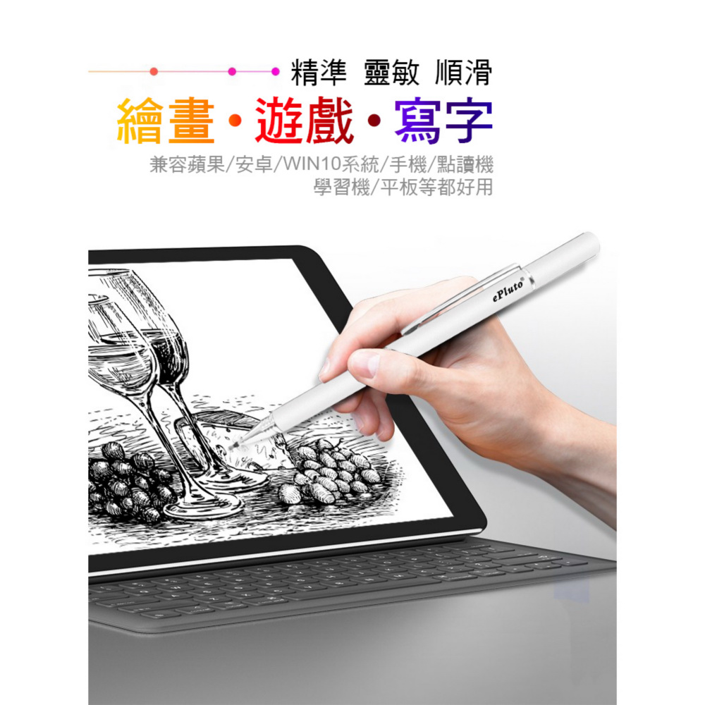 《商品介紹》攜帶方便,隨意書寫想畫就畫,想寫就寫免裝軟體,無需藍芽配對■書寫/塗鴉/繪圖最佳利器■適用所有電容式觸控螢幕■順滑好書寫■好握好寫,攜帶方便■筆夾設計,更方便隨身攜帶1. 本產品適用所有"蘋果/安卓/微軟"電容式觸控螢幕。2. 細字觸控筆,穩定/耐用/實用。3. 適用範圍更廣,可以使用在所有型號的iPad及iPhone, 更可以使用在電容式觸控螢幕的安卓平版及手機,微軟系統的電容式觸控螢幕也都適用。4. 不需搭配APP或是藍芽使用。5. 不需充電及電池就可以使用。