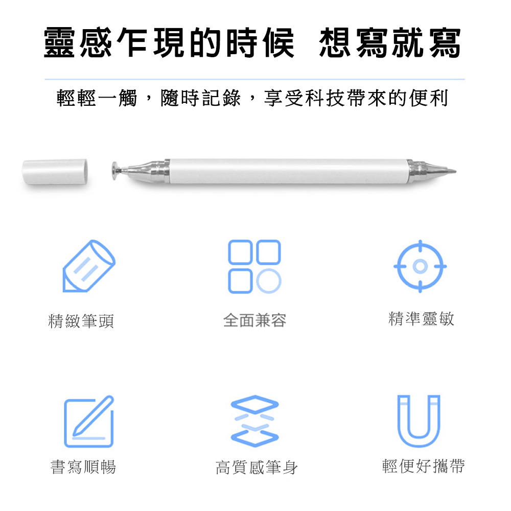 《商品介紹》攜帶方便,隨意書寫想畫就畫,想寫就寫免裝軟體,無需藍芽配對■書寫/塗鴉/繪圖最佳利器■適用所有電容式觸控螢幕■順滑好書寫■好握好寫,攜帶方便■雙頭觸控設計,觸控及書寫同時兼顧1. 本產品適用所有”蘋果/安卓/微軟”電容式觸控螢幕。2. 細字觸控筆,穩定/耐用/實用。3. 適用範圍更廣,可以使用在所有型號的iPad及iPhone, 更可以使用在電容式觸控螢幕的安卓平版及手機,微軟系統的電容式觸控螢幕也都適用。4. 書寫,精密圖稿設計,繪畫,塗抹都適合。