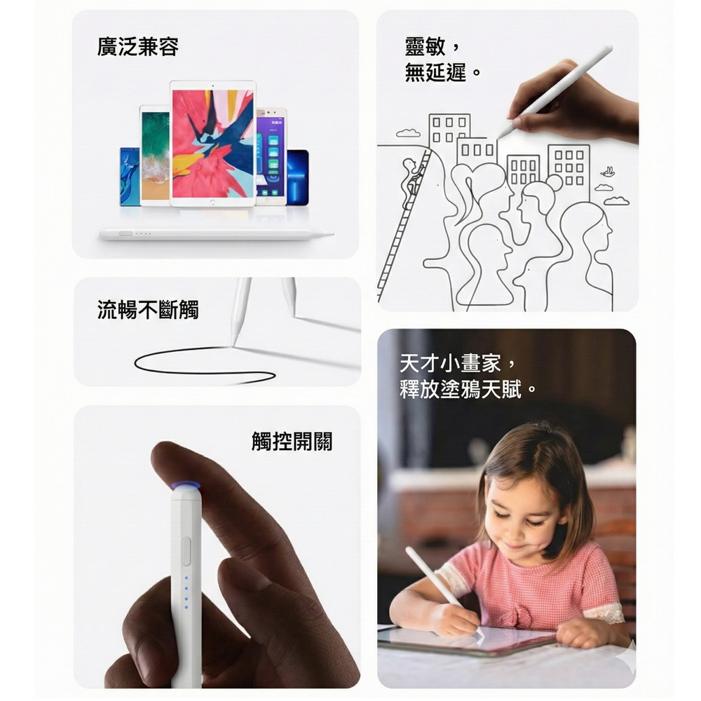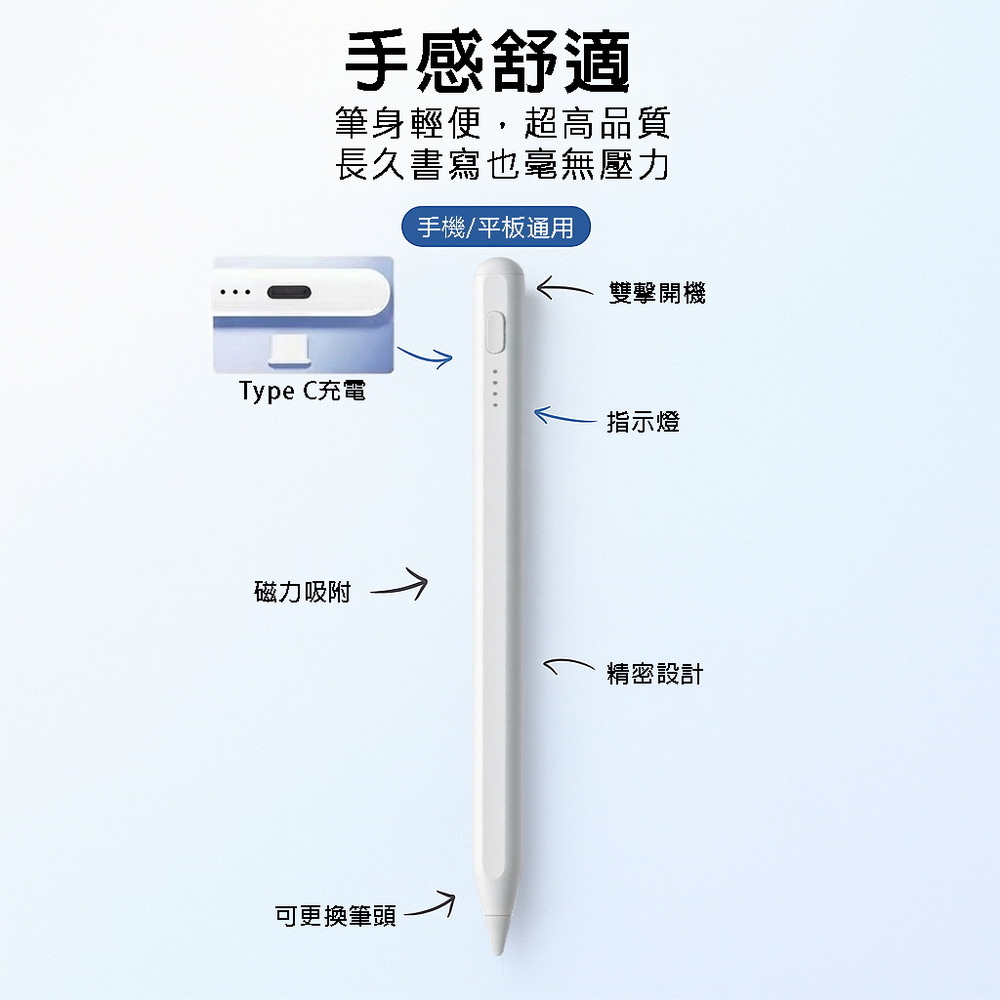 《商品介紹》攜帶方便,隨意書寫想畫就畫,想寫就寫免裝軟體,無需藍芽配對■書寫/塗鴉/繪圖最佳利器■順滑好書寫■好握好寫,攜帶方便■內建鋰電池充電設計■方便隨身攜帶1. 適用各款電容式觸控螢幕的手機或平板。2. 安卓/蘋果/微軟系統的手機或平板都適用。3. 精密耐用纖維觸控筆頭,穩定/耐用/實用。4. 操作快速簡易,隨拿即用5. 不需搭配APP或是藍芽使用。6. 觸控位置精準,書寫非常流暢7. 本商品不是”蘋果Apple Pencil”,也與”蘋果Apple Pencil”功能不同,請確認後再購買。《注意事項》這是通用款觸控筆,適用安卓/蘋果/微軟系統的手機或平板,但沒有防誤觸功能,請先確認後再購買
