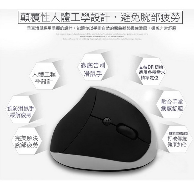 《商品介紹》握感就是這麼舒適長時間使用滑鼠一點都不累真正人體工學垂直設計光學定位精準靈敏,滾輪滾動非常流暢不需安裝任何軟體驅動,隨插即用保護手腕,避免長期使用滑鼠造成職業傷害靈敏感應,滑動自如