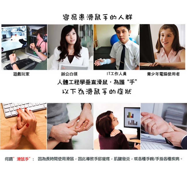 《商品介紹》握感就是這麼舒適長時間使用滑鼠一點都不累真正人體工學垂直設計光學定位精準靈敏,滾輪滾動非常流暢不需安裝任何軟體驅動,隨插即用保護手腕,避免長期使用滑鼠造成職業傷害靈敏感應,滑動自如