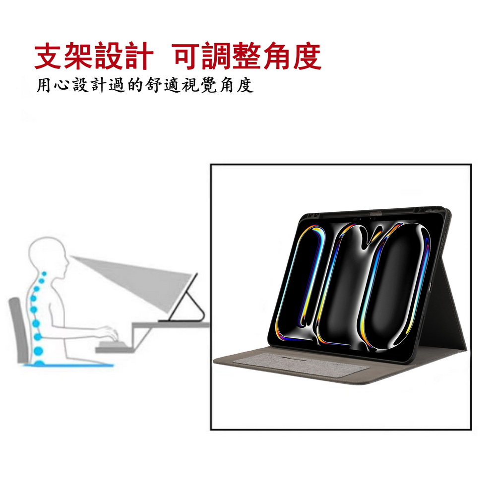 《商品介紹》輕輕呵護您的iPad平板精緻輕薄,方便好攜帶• 專為新款iPad平板量身設計• 精準孔位,操作方便• 輕鬆架立,視角任你調整• 四角緊密保護防撞,減緩碰撞衝擊1.本商品適用Apple iPad Air 11吋 2024 平板2.智慧休眠,節省電量3.完全包覆平板,防摔減震4.柔軟矽膠材質,拆卸不傷機5.多種角度架立設計,架立穩固支撐《注意事項》本商品不含平板主機