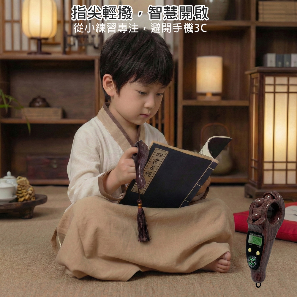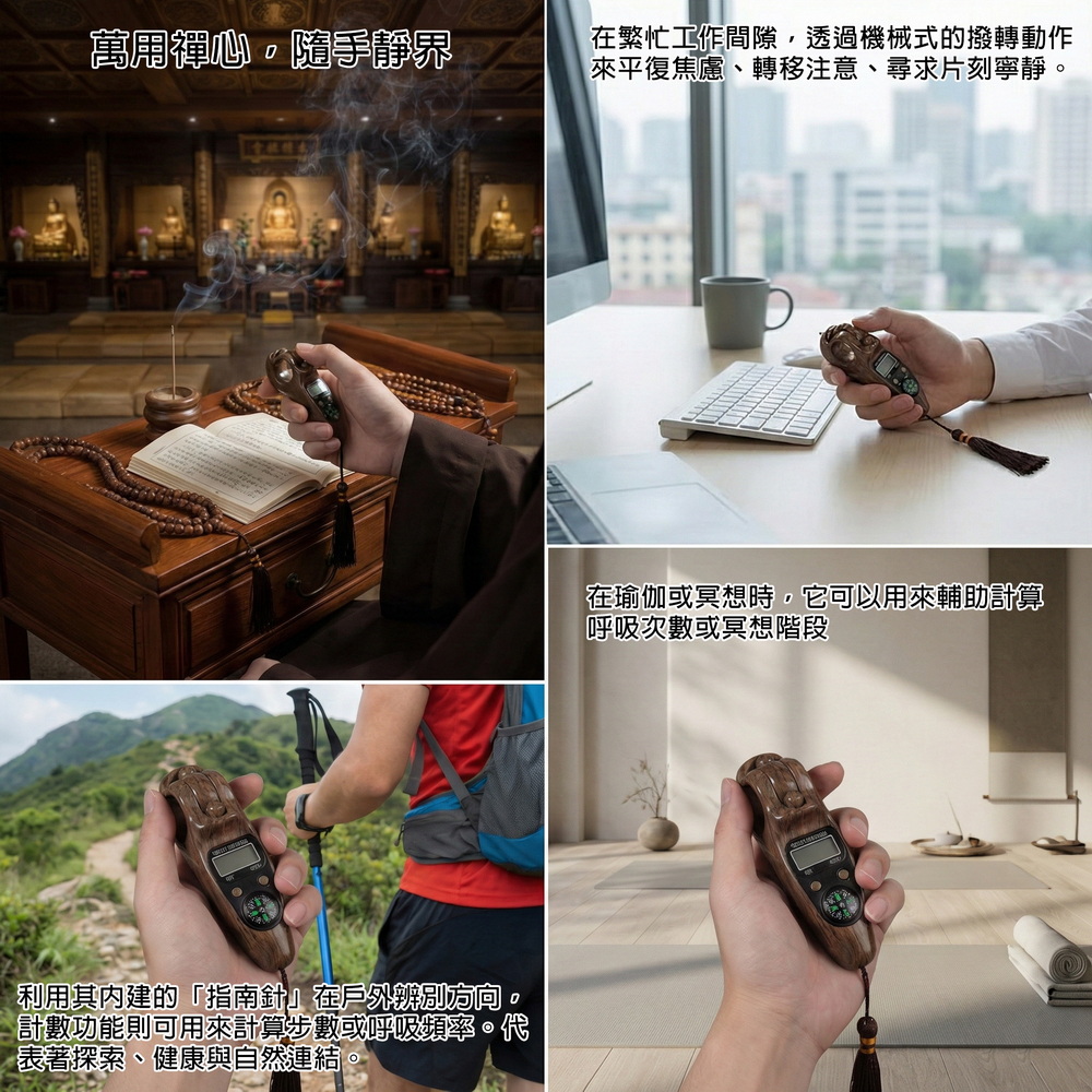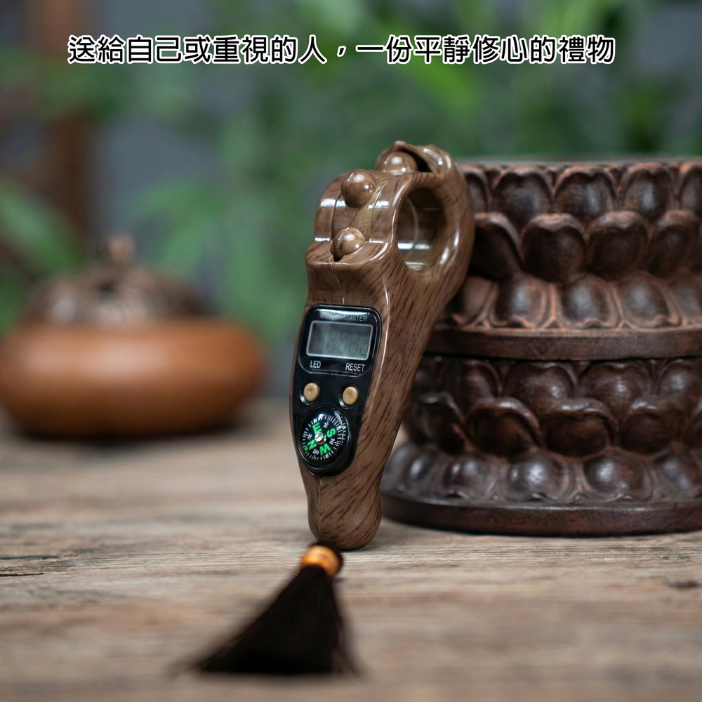 《商品介紹》計數無憂,放鬆更專注指尖修行,靜心計數智慧伴侶滾珠計數,讓專注與放鬆同時到位指尖輕撥,心境自闊每一轉,都是靜心的開始修行冥想,專注訓練輕量隨行,持久續航在繁雜的生活中,找回規律與寧靜傳統念珠的厚重感,在現代生活中有了更輕盈的選擇。這款計數器模擬撥動佛珠的手感,讓你隨時隨地都能進入專注靜心的狀態。無論是冥想打坐、誦經計數,或是日常壓力下的指尖放鬆,它都能幫你記下每一分寧靜。指尖上的修行:操作簡單,靜心計數,讓專注與放鬆同時到位。一器在手,計數無憂,放鬆更專注內置滾珠保護設計,耐摔耐用,隨身攜帶也安心多色木紋外殼,時尚耐看,適合居家、辦公、瑜伽、冥想與工作休憩禪修、祈禱、靜心等安定心緒的實用小物手感舒適、握持穩定:長時間操作也不易疲憊【應用場景】修行冥想:數位顯示清晰,精準記錄念經、持咒次數,讓修行無礙。戶外探險: 內建指南針,助您在登山健行時辨別方向;計數功能亦可記錄步數或呼吸頻率。長輩使用:轉動滾珠作為日常手部活動的小物,操作簡單、握持舒適。專注訓練: 陪伴孩童練習專注,遠離3C產品,從指尖練習靜心。辦公解壓:工作間隙揉動滾珠減壓,安靜不擾人,計數任務提升專注,會議或加班皆宜。學習閱讀:讀書計頁數、寫作記單字,舒適握持掛繩便攜,輔助學生考試或研究進度。