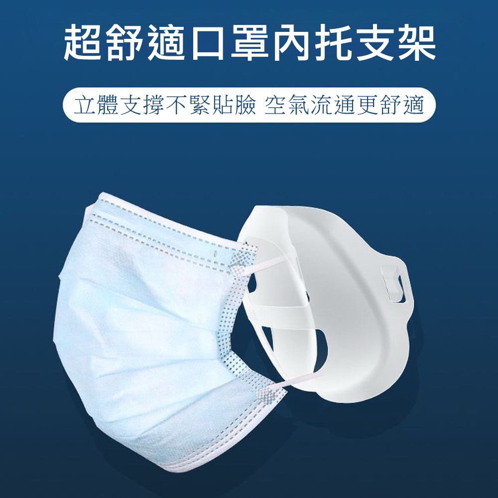 《商品介紹》搭配口罩的最佳神器解決長時間配戴口罩的困擾立體支撐 空氣流通更舒適人體工學設計 3D立體支撐• 適合不同臉型使用• 減少直接接觸口罩 增加安全• 使用便利 簡易扣掛• 舒適 透氣 清爽• 可水洗重複使用《注意事項》1. 本商品不含口罩,商品主體是口罩支架2. 本商品的尺寸是混合出貨,大尺寸適合成人的臉型及尺寸使用,小尺寸適合兒童的臉型及尺寸使用。3. 本商品是屬於衛生用品類,商品拆封後,不再享有退貨服務。