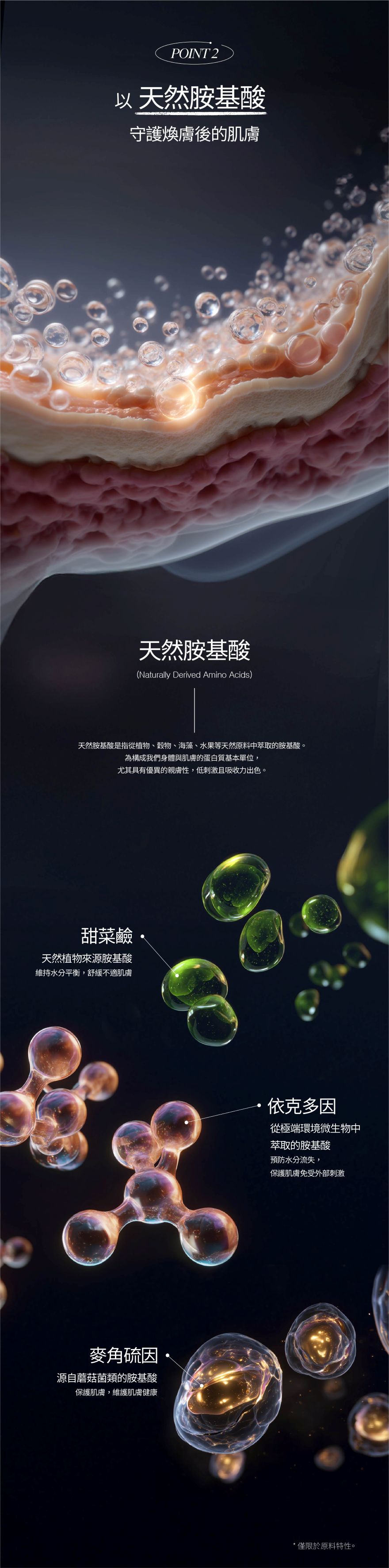 結合 AHA、PHA、LHA 三重溫和酸類成分,搭配海茴香萃取與仿生親膚油脂