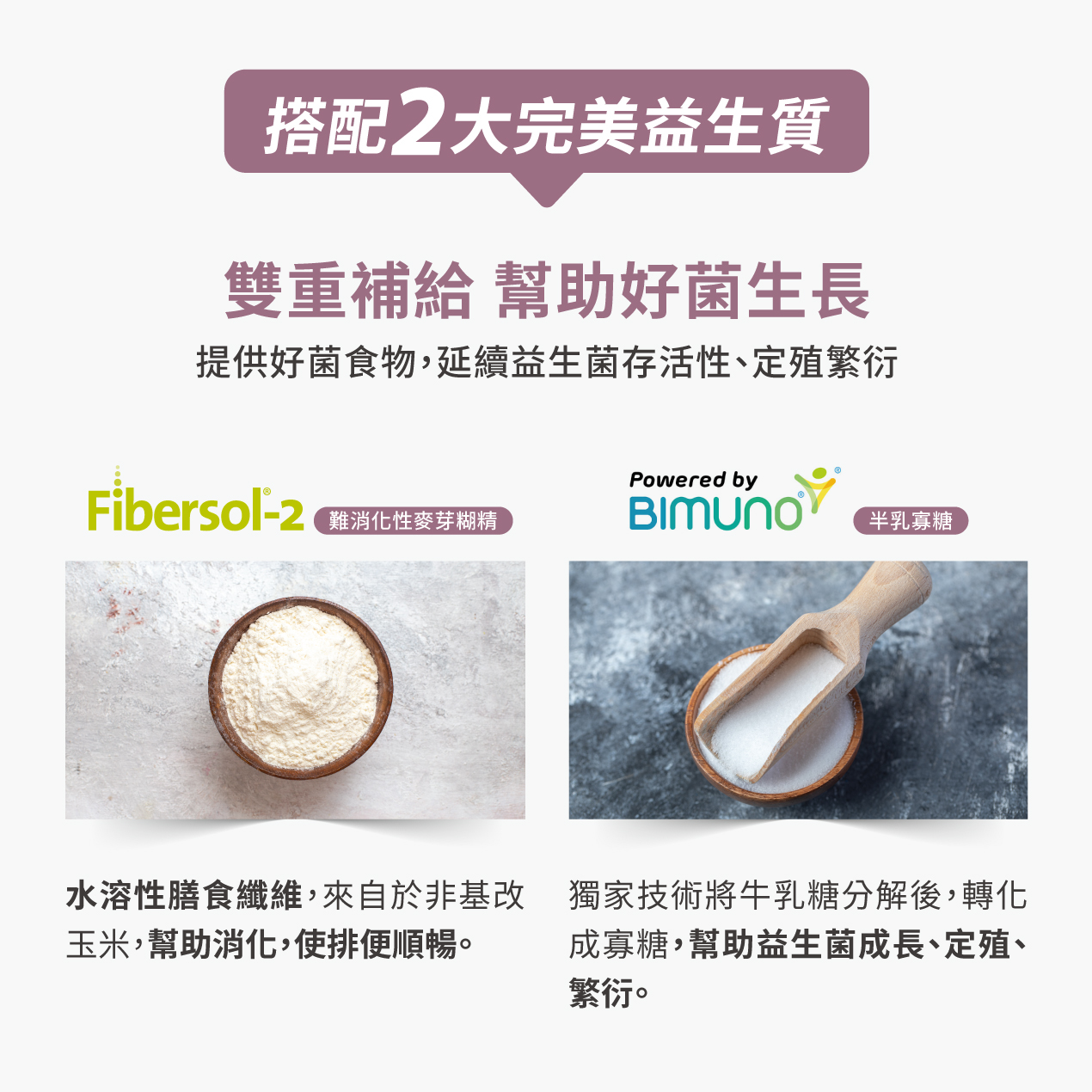 難消化性麥芽糊精(玉米來源可溶性纖維)、副乾酪乳酸桿菌L.paracasei菌粉、比菲德氏龍根菌B.longum菌粉、半乳寡糖、鼠李糖乳酸桿菌L.rhamnosu菌粉