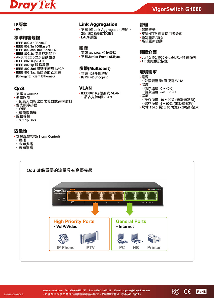 昌運監視器 DrayTek VigorSwitch G1080 8埠簡易管理型Gigabit網路交換器