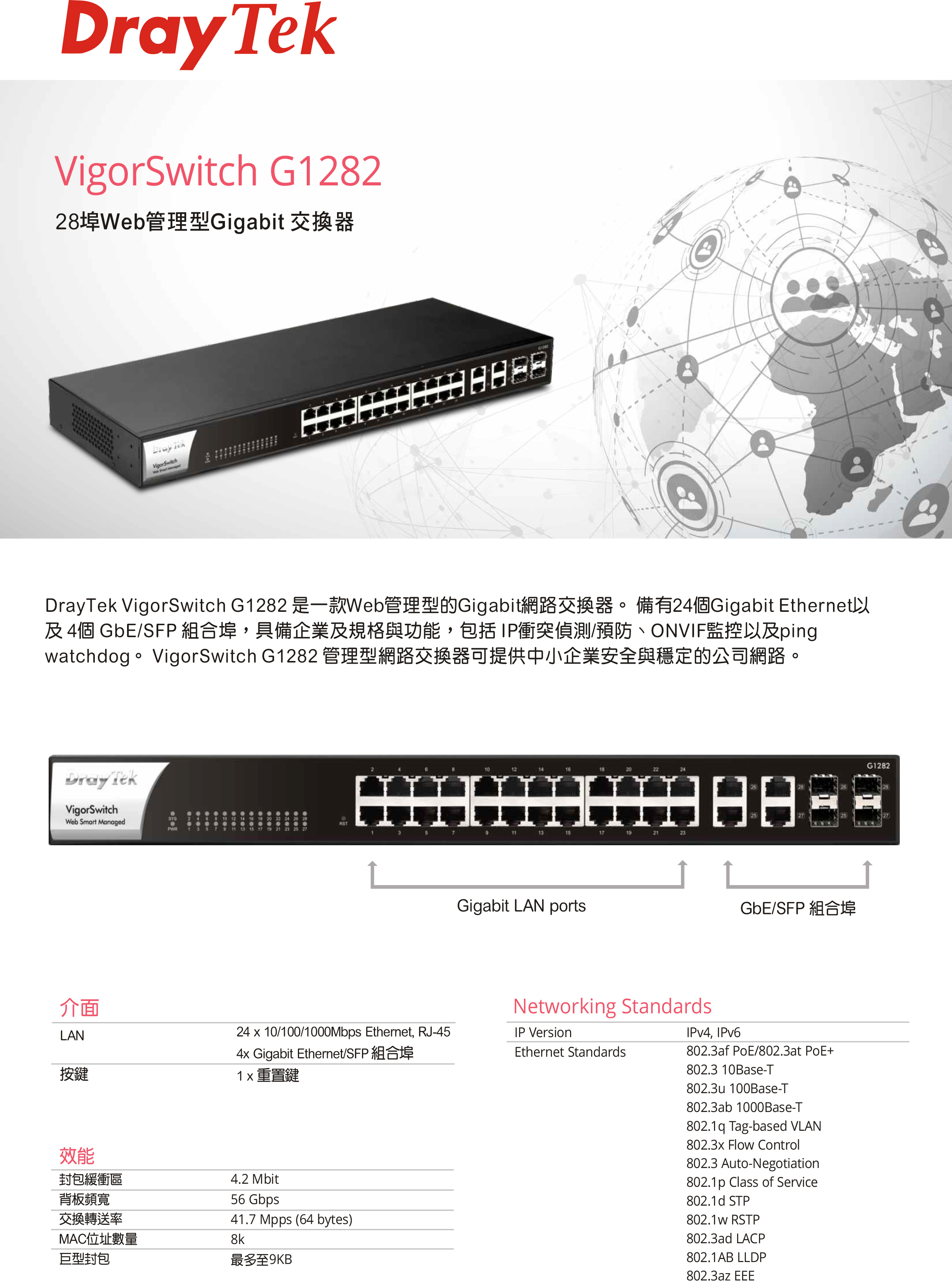 DrayTek VigorSwitch G1282 是一款網路智慧型千兆交換器。它有 24 個千兆乙太網路連接埠和 4 個千兆乙太網路/SFP 組合連接埠。