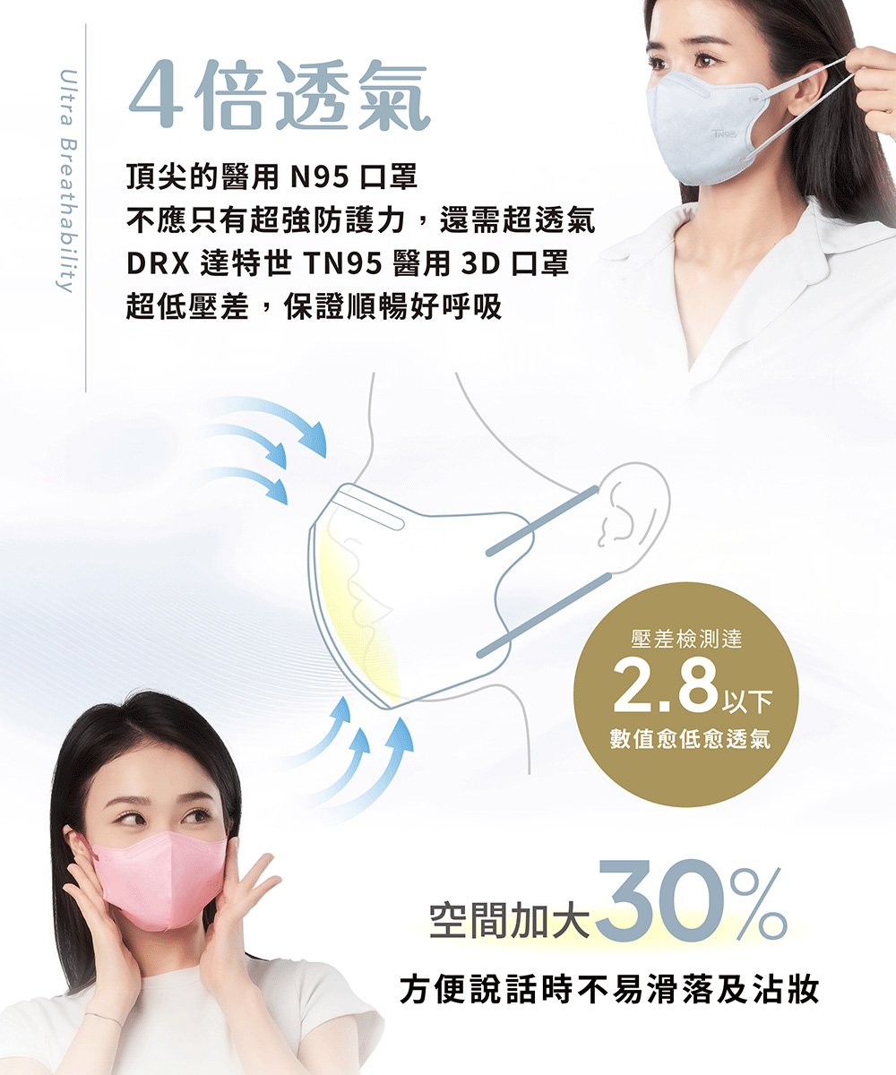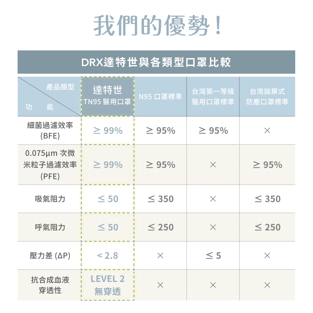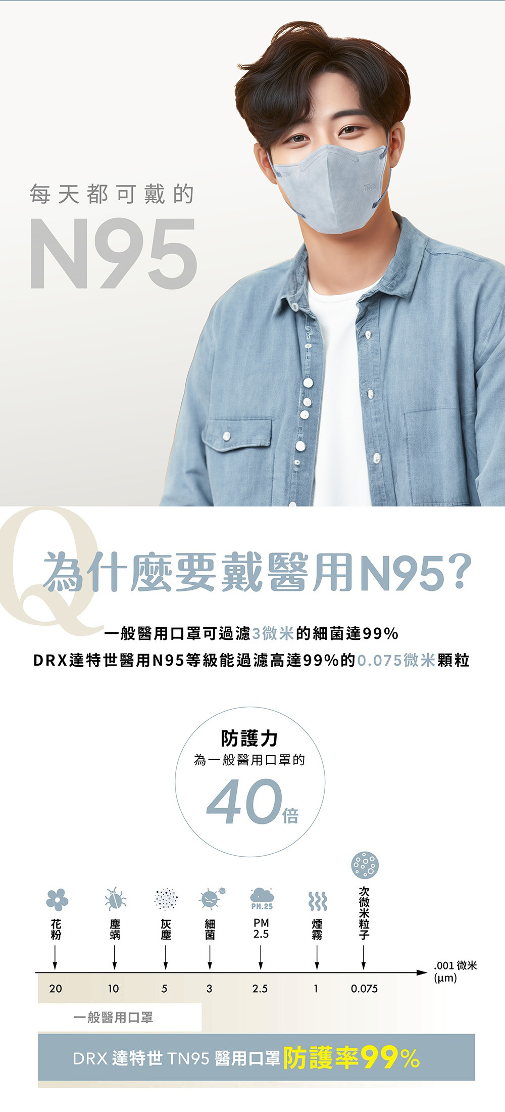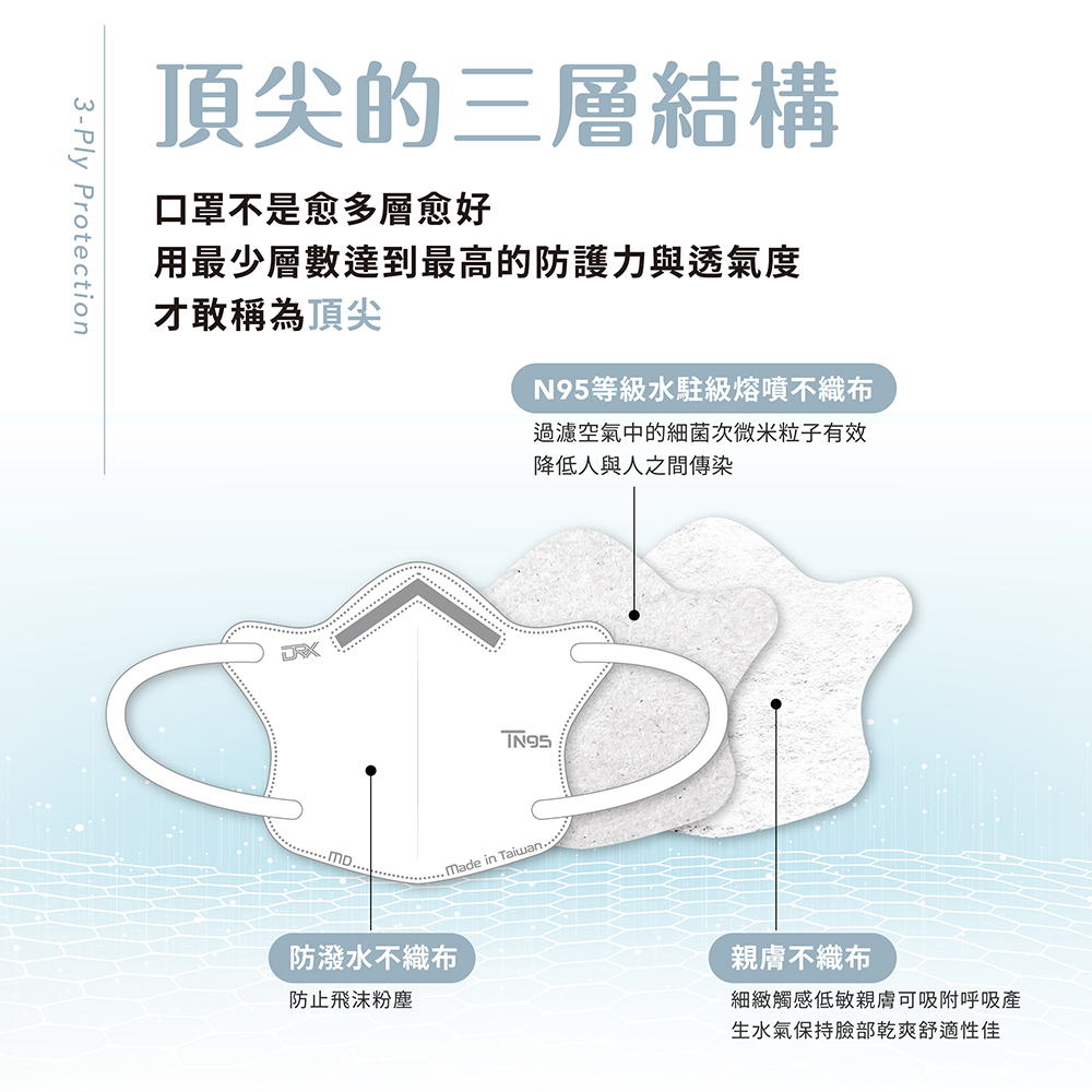 「消費者使用前應詳閱醫療器材說明書」●醫療器材品名:"達特世" TN95 醫用防護口罩 (未滅菌)●醫療器材許可證字號:衛部醫器製壹字第009814號●許可證所有人:達特世生技有限公司●許可證所有人地址:新北市三重區溪尾街14號5樓●製造業者名稱:達特世生技有限公司●製造業者地址:新北市三重區溪尾街14號5樓之1及5樓之2●醫療器材商名稱:達特世生技有限公司●醫療器材商地址:新北市三重區溪尾街14號5樓●醫療器材商許可證字號:新北府重衛醫器販字第 MD6231017084 號●醫療器材商諮詢專線:02-22868689品牌:DRX 達特世規格:20入/1組貨源:自產自銷產地:台灣材質:不織布保存期限:4年「此商品屬個人衛生用品,不適用七天鑑賞期法規,拆封無猶豫期,如欲退貨請勿拆封。」【小提醒】※假日不出貨,顏色及數量已當下實際庫存量為主,庫存量不足將另行通知※※蝦皮代開發票,發票如需開立統編抬頭,請結帳前,務必填寫完整。※※口罩屬個人衛生用品故經拆封後符合消保法第十九條所訂定之合理例外情事,無七日猶豫期,如欲退貨請勿拆封※※每批布的顏色,略有色差,依實際出貨商品為主※注意: 由於超商有寄貨限制,一筆訂單最多18盒 (如果超過18盒, 請分兩筆訂單下單)注意: 由於超商有寄貨限制,一筆訂單最多18盒 (如果超過18盒, 請分兩筆訂單下單)注意: 由於超商有寄貨限制,一筆訂單最多18盒 (如果超過18盒, 請分兩筆訂單下單)#不脫妝 #單片包裝 #防脫妝 #獨立包裝 #透氣 #N95 【商品特色】✨全新改版 3D立體美型剪裁✨全新升級 日本高規鼻樑壓條+無壓力耳繩設計✨防護透氣4倍升級舒適度再進化✨單片獨立包裝,方便攜帶✨通過台灣TN95認證(CNS14774/CNS 14755)✨台灣生產製造,品質保證【商品資訊】●醫療器材品名:"達特世" TN95 醫用防護口罩 (未滅菌)●醫療器材許可證字號:衛部醫器製壹字第009814號●規格:20片/盒●顏色:冰晶白/炫耀黑/莫內四色/胭脂四色/都會四色●尺寸:S幼幼:9.5cm x 8.5cm【建議1-4歲】M兒童:11.5cm x 9cm【建議4歲以上】L成人:13.5cm x 10.5cmXL成人加大:15cm x 11cm●主要成分或材料:防潑水性不織布、N95等級水駐極熔噴不織布、親膚性不織布●保存期限:4年●製造日期:2025.01.26●商品原產地:台灣【醫療器材許可證】核定中文品名: “達特世” TN95 醫用防護口罩 (未滅菌)核准字號:衛部醫器製壹字第009814號製造業者名稱:達特世生技有限公司製造業者地址:新北市三重區溪尾街14號5樓之1及5樓之2【販賣業醫療器材商許可執照】許可執照字號: 新北府重衛醫器販字第 MD6231017084 號醫療器材商名稱:達特世生技有限公司地址:新北市三重區溪尾街14號5樓諮詢專線電話:02-22868689