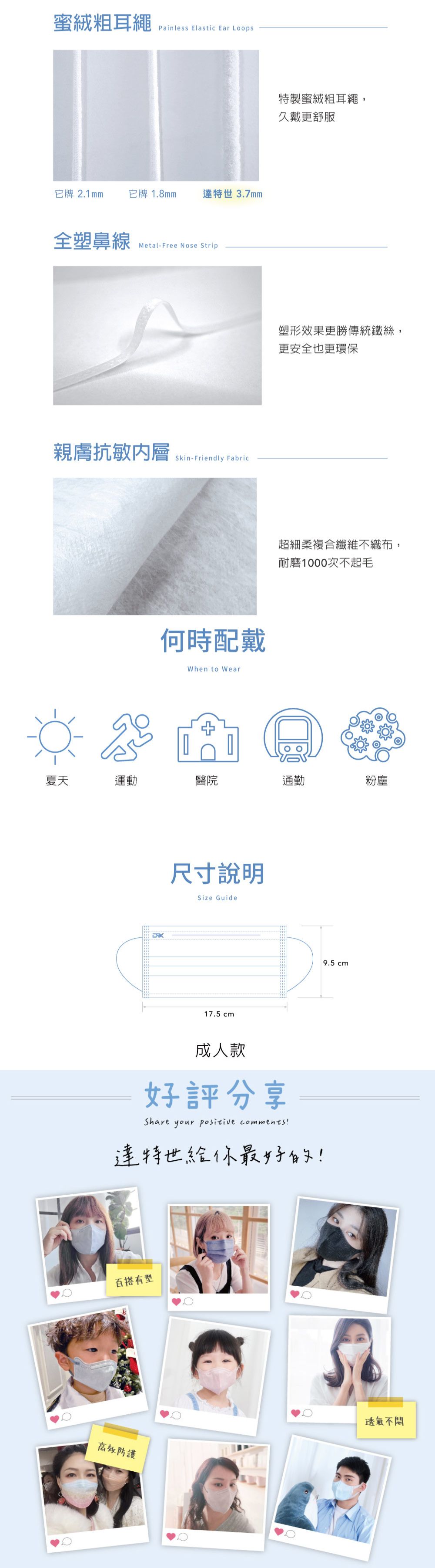 「消費者使用前應詳閱醫療器材說明書」●醫療器材品名: "達特世" 醫用口罩 (未滅菌)●醫療器材許可證字號:衛部醫器製壹字第008685號●許可證所有人:達特世生技有限公司●許可證所有人地址:新北市三重區溪尾街14號5樓●製造業者名稱:達特世生技有限公司●製造業者地址:新北市三重區溪尾街14號5樓之1及5樓之2●醫療器材商名稱:達特世生技有限公司●醫療器材商地址:新北市三重區溪尾街14號5樓●醫療器材商許可證字號:新北府重衛醫器販字第 MD6231017084 號●醫療器材商諮詢專線:02-22868689品牌:DRX 達特世規格:25入/1組 30入/1組貨源:自產自銷產地:台灣材質:不織布保存期限:5年「此商品屬個人衛生用品,不適用七天鑑賞期法規,拆封無猶豫期,如欲退貨請勿拆封。」【小提醒】服務時間:周一至週五 09:00 ~ 18:00 (例假日、國定假日除外)假日不出貨,顏色及數量已當下實際庫存量為主,庫存量不足將另行通知!※口罩屬個人衛生用品故經拆封後符合消保法第十九條所訂定之合理例外情事,無七日猶豫期,如欲退貨請勿拆封※※每批布的顏色,略有色差,依實際出貨商品為主※#不脫妝 #單片包裝 #防脫妝 #獨立包裝 #小顏 #日本口罩注意: 由於超商有寄貨限制,一筆訂單最多18盒 (如果超過18盒, 請分兩筆訂單下單)注意: 由於超商有寄貨限制,一筆訂單最多18盒 (如果超過18盒, 請分兩筆訂單下單)注意: 由於超商有寄貨限制,一筆訂單最多18盒 (如果超過18盒, 請分兩筆訂單下單)【商品資訊】●醫療器材品名: "達特世" 醫用口罩 (未滅菌)●醫療器材許可證字號:衛部醫器製壹字第008685號●規格:天空藍/櫻花粉/洋香橘/浪漫紫/純白 30片/盒 (單色)五色款25片/盒(每色各5片,共25片)●尺寸:17.5cm*9.5cm(±0.5cm)●主要成分或材料:防潑水性不織布、HEPA熔噴不織布、親膚性不織布●保存期限:5年●製造日期: 2025.01.16●商品原產地:台灣●貨源:公司貨【醫療器材許可證】核定中文品名: "達特世" 醫用口罩 (未滅菌)核准字號:衛部醫器製壹字第008685號製造業者名稱:達特世生技有限公司製造業者地址:新北市三重區溪尾街14號5樓之1及5樓之2【販賣業醫療器材商許可執照】許可執照字號: 新北府重衛醫器販字第 MD6231017084 號醫療器材商名稱:達特世生技有限公司地址:新北市三重區溪尾街14號5樓諮詢專線電話:02-22868689