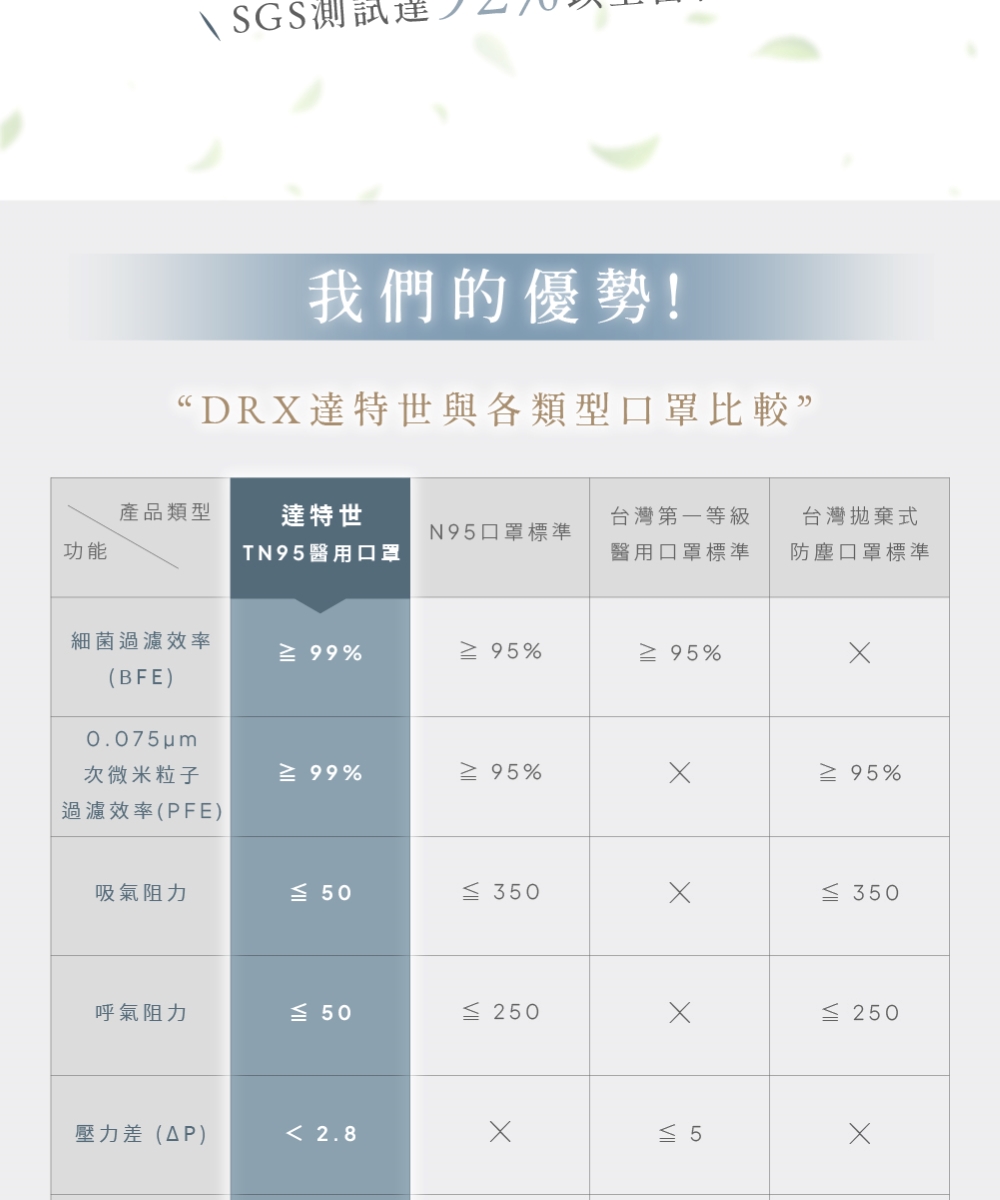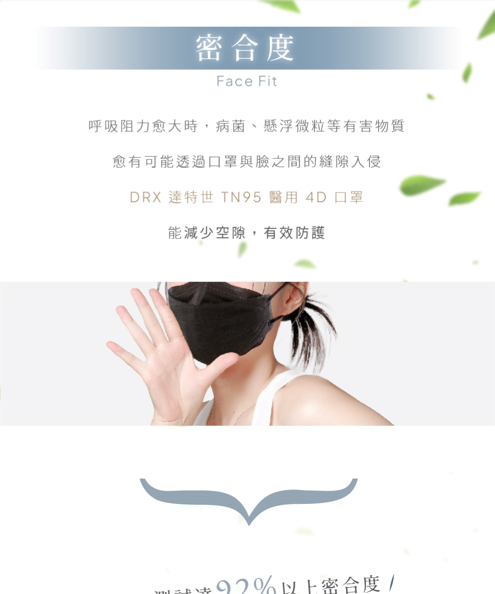 「消費者使用前應詳閱醫療器材說明書」●醫療器材品名:"達特世" TN95 醫用防護口罩 (未滅菌)●醫療器材許可證字號:衛部醫器製壹字第009814號●許可證所有人:達特世生技有限公司●許可證所有人地址:新北市三重區溪尾街14號5樓●製造業者名稱:達特世生技有限公司●製造業者地址:新北市三重區溪尾街14號5樓之1及5樓之2●醫療器材商名稱:達特世生技有限公司●醫療器材商地址:新北市三重區溪尾街14號5樓●醫療器材商許可證字號:新北府重衛醫器販字第 MD6231017084 號●醫療器材商諮詢專線:02-22868689品牌:DRX 達特世規格:20入/1組貨源:自產自銷產地:台灣材質:不織布保存期限:4年「此商品屬個人衛生用品,不適用七天鑑賞期法規,拆封無猶豫期,如欲退貨請勿拆封。」📌注意事項此款口罩舊版D2外包裝,口罩材質與效能與TN95視為一樣,請您安心購買🙏🏻通過 CNS 14774 / CNS 14755 測試標準TN95/D2 等級 等同於美國N95的過濾效果TN95/D2 等級 等同於美國N95的過濾效果TN95/D2 等級 等同於美國N95的過濾效果給您更好的防護【小提醒】服務時間:周一至週五 09:00 ~ 18:00 (例假日、國定假日除外)假日不出貨,顏色及數量已當下實際庫存量為主,庫存量不足將另行通知!※口罩屬個人衛生用品故經拆封後符合消保法第十九條所訂定之合理例外情事,無七日猶豫期,如欲退貨請勿拆封※※每批布的顏色,略有色差,依實際出貨商品為主※注意: 由於超商有寄貨限制,一筆訂單最多18盒 (如果超過18盒, 請分兩筆訂單下單)注意: 由於超商有寄貨限制,一筆訂單最多18盒 (如果超過18盒, 請分兩筆訂單下單)注意: 由於超商有寄貨限制,一筆訂單最多18盒 (如果超過18盒, 請分兩筆訂單下單)【商品資訊】●醫療器材品名:"達特世" D2醫用防護口罩 (未滅菌)●醫療器材許可證字號:衛部醫器製壹字第009265號●規格:20片/盒●尺寸:【成人】20.5cmX8.1cm (±0.5cm)【兒童】17.2cmX6.8cm (±0.5cm) 【建議3-12歲】●主要成分或材料:防潑水不織布、D2/N95 熔噴不織布、親膚性不織布●保存期限:4年●製造日期: 2025.01.08●商品原產地:台灣●貨源:公司貨【醫療器材許可證】核定中文品名:"達特世" TN95 醫用防護口罩 (未滅菌)核准字號:衛部醫器製壹字第009814號製造業者名稱:達特世生技有限公司製造業者地址:新北市三重區溪尾街14號5樓之1及5樓之2核定中文品名:"達特世" D2醫用防護口罩 (未滅菌)核准字號:衛部醫器製壹字第009265號製造業者名稱:達特世生技有限公司製造業者地址:新北市三重區溪尾街14號5樓之1及5樓之2【販賣業醫療器材商許可執照】許可執照字號: 新北府重衛醫器販字第 MD6231017084 號醫療器材商名稱:達特世生技有限公司地址:新北市三重區溪尾街14號5樓諮詢專線電話:02-22868689