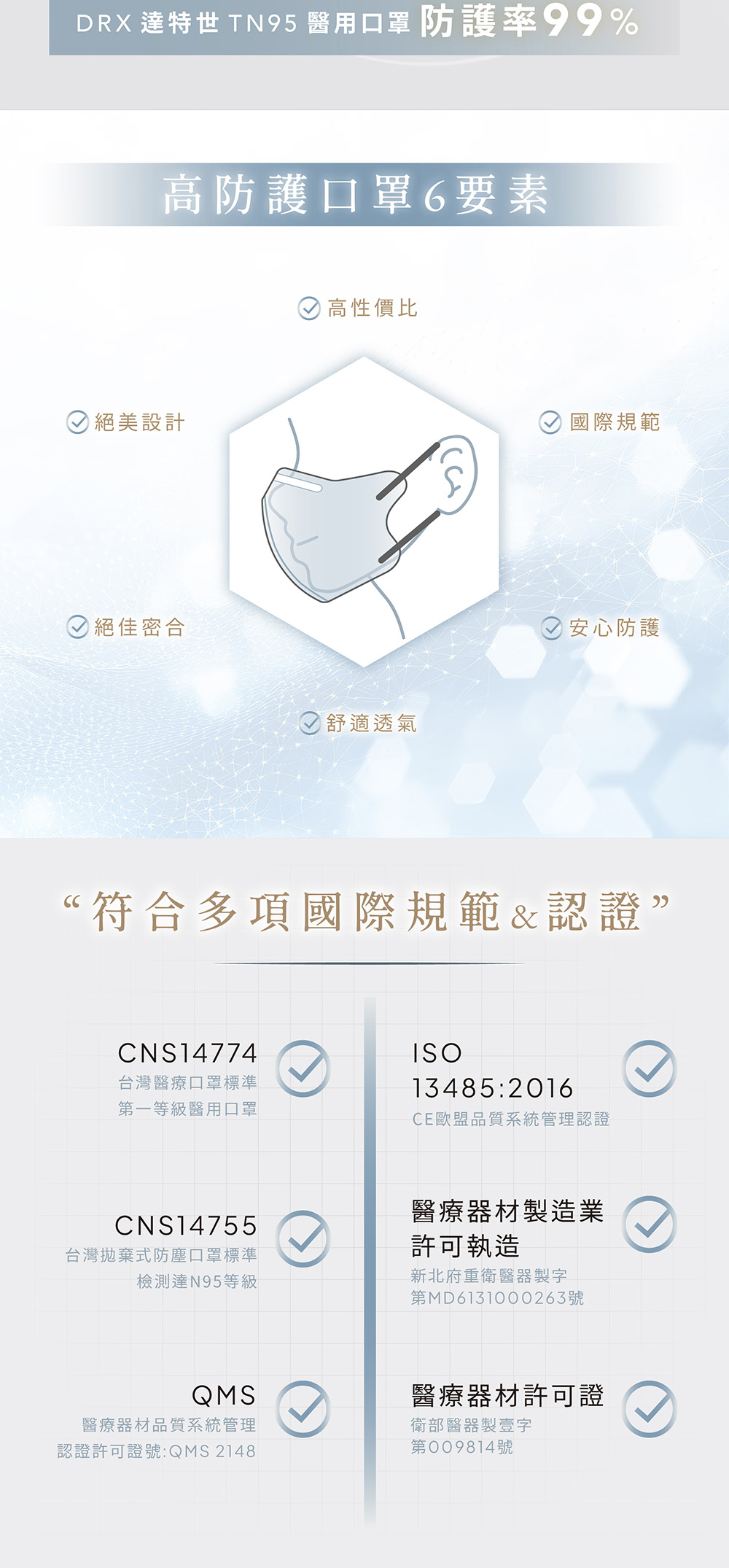 「消費者使用前應詳閱醫療器材說明書」●醫療器材品名:"達特世" TN95 醫用防護口罩 (未滅菌)●醫療器材許可證字號:衛部醫器製壹字第009814號●醫療器材品名:"達特世" D2醫用防護口罩 (未滅菌)●醫療器材許可證字號:衛部醫器製壹字第009265號●許可證所有人:達特世生技有限公司●許可證所有人地址:新北市三重區溪尾街14號5樓●製造業者名稱:達特世生技有限公司●製造業者地址:新北市三重區溪尾街14號5樓之1及5樓之2●醫療器材商名稱:達特世生技有限公司●醫療器材商地址:新北市三重區溪尾街14號5樓●醫療器材商許可證字號:新北府重衛醫器販字第 MD6231017084 號●醫療器材商諮詢專線:02-22868689品牌:DRX 達特世規格:10入/1組貨源:自產自銷產地:台灣材質:不織布保存期限:4年「此商品屬個人衛生用品,不適用七天鑑賞期法規,拆封無猶豫期,如欲退貨請勿拆封。」📌注意事項此款口罩為舊版D2外包裝,口罩材質與效能與TN95相同,請您安心購買🙏🏻通過 CNS 14774 / CNS 14755 測試標準TN95/D2 等級 等同於美國 N95的過濾效果TN95/D2 等級 等同於美國 N95的過濾效果TN95/D2 等級 等同於美國 N95的過濾效果給您更好的防護服務時間:周一至週五 09:00 ~ 18:00 (例假日、國定假日除外)假日不出貨,顏色及數量已當下實際庫存量為主,庫存量不足將另行通知!注意: 由於超商有寄貨限制,一筆訂單最多18盒 (如果超過18盒, 請分兩筆訂單下單)注意: 由於超商有寄貨限制,一筆訂單最多18盒 (如果超過18盒, 請分兩筆訂單下單)注意: 由於超商有寄貨限制,一筆訂單最多18盒 (如果超過18盒, 請分兩筆訂單下單)【商品資訊】●醫療器材品名:"達特世" TN95 醫用防護口罩 (未滅菌)●醫療器材許可證字號:衛部醫器製壹字第009814號●醫療器材品名:"達特世" D2醫用防護口罩 (未滅菌)●醫療器材許可證字號:衛部醫器製壹字第009265號●規格:10片/袋●尺寸:S幼幼:9.5cm x 8.5cm【建議1-4歲】M兒童:11.5cm x 9cm【建議4歲以上】●主要成分或材料:防潑水不織布、D2/N95 熔噴不織布、親膚性不織布●保存期限:4年●製造日期:2025.01.16●商品原產地:台灣●貨源:公司貨【醫療器材許可證】核定中文品名: "達特世" 醫用口罩 (未滅菌)核准字號:衛部醫器製壹字第008685號製造業者名稱:達特世生技有限公司製造業者地址:新北市三重區溪尾街14號5樓之1及5樓之2【販賣業醫療器材商許可執照】●許可執照字號: 新北府重衛醫器販字第 MD6231017084 號●醫療器材商名稱:達特世生技有限公司●地址:新北市三重區溪尾街14號5樓●諮詢專線電話:02-22868689【衛部醫器製壹字第009265號】●藥商:達特世生技有限公司●地址: 新北市三重區溪尾街14號5樓之1及5樓之1 ※每批布的顏色,略有色差,依實際出貨商品為主※※口罩屬個人衛生用品故經拆封後符合消保法第十九條所訂定之合理例外情事,無七日猶豫期,如欲退貨請勿拆封※