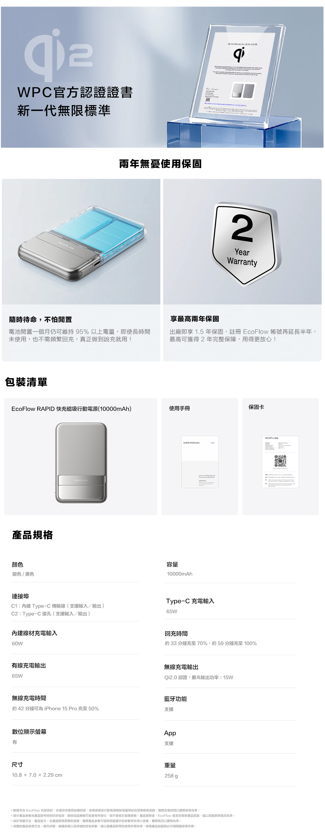 Qi2 無線快充 15W:支援 Qi2 認證的 15W 無線快充,充電速度是傳統 Qi1(7.5W)的兩倍,快速、安全又高效,隨時補電更省時。