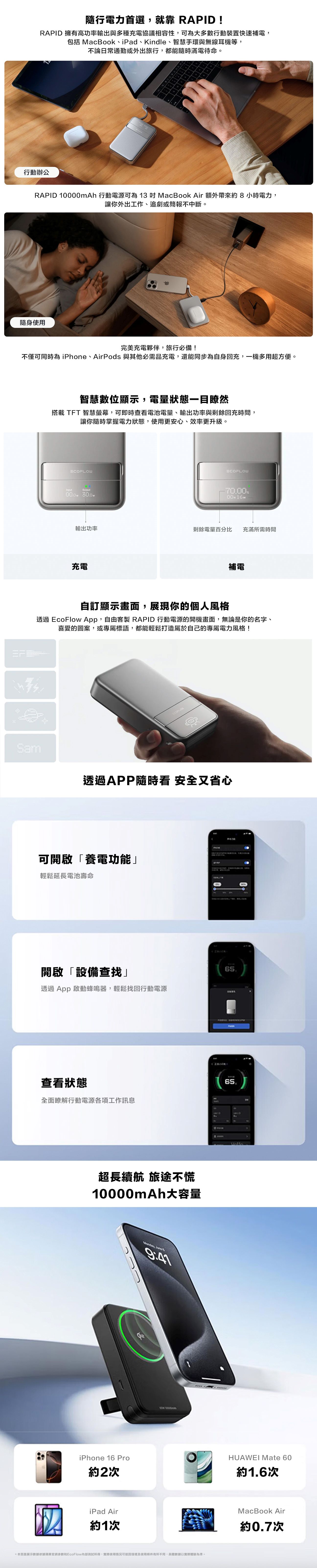 65W 內建快充線,急速補電無需外接:內建 65W Type-C 快充線,出門免帶線材,隨插即充。可為 13 吋 MacBook Air 提供最高約 8 小時續航,關鍵時刻立即補電。