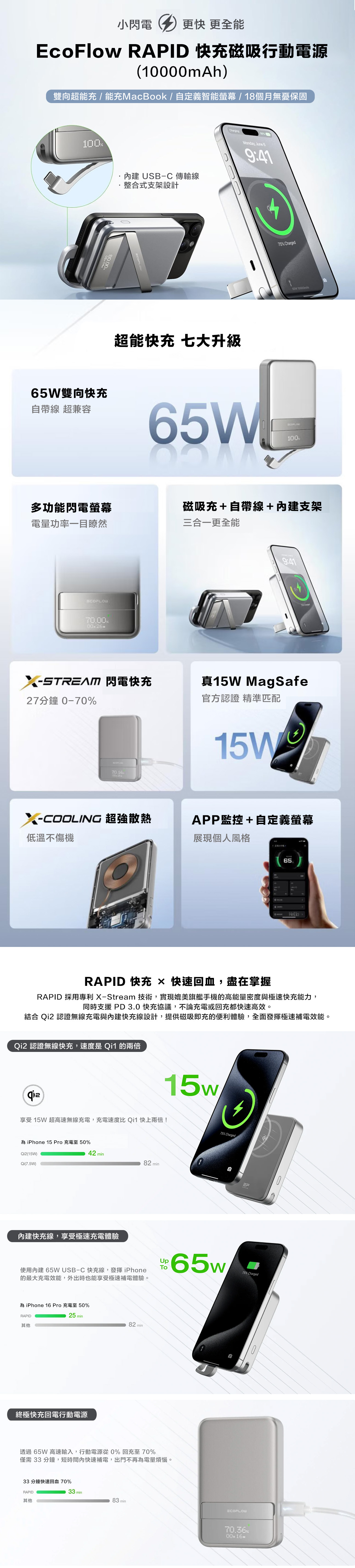 閃電回血,快速回充不等待:支援 30W 輸入,從 0% 回充至 70% 只需不到 33 分鐘,快速補電,準備出門剛剛好。