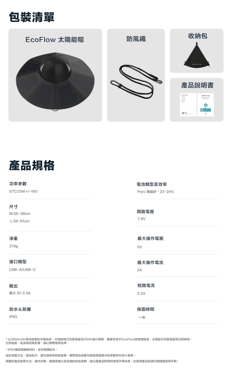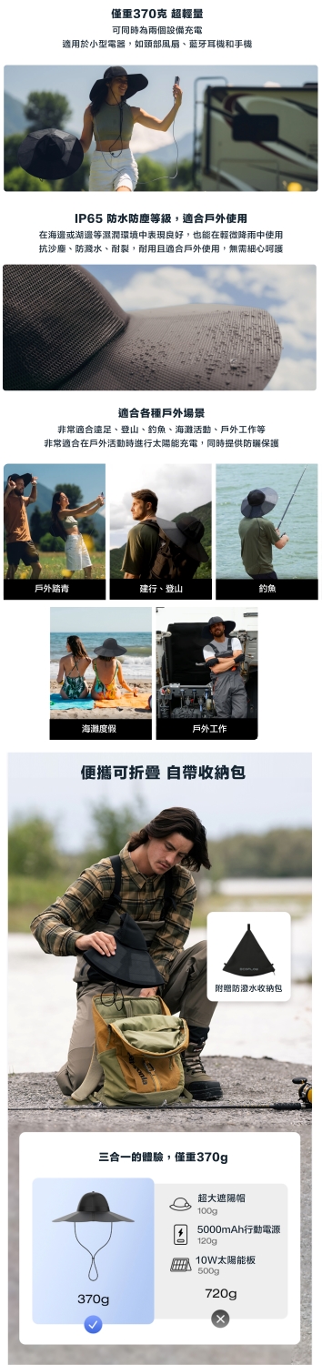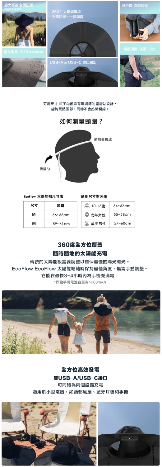 • 隨時隨地的太陽能充電• 從各個角度捕捉太陽能,沒有死角。• 配有雙USB-A和USB-C接口,可同時充電兩個設備。• 重量僅 370克,輕巧易攜帶。• IP65防水防塵等級,適合遠足、海灘旅行、釣魚及戶外活動。• 提供兩種頭圍尺寸:58/61公分(M:58/L:61),可調節魔術貼,確保完美貼合。