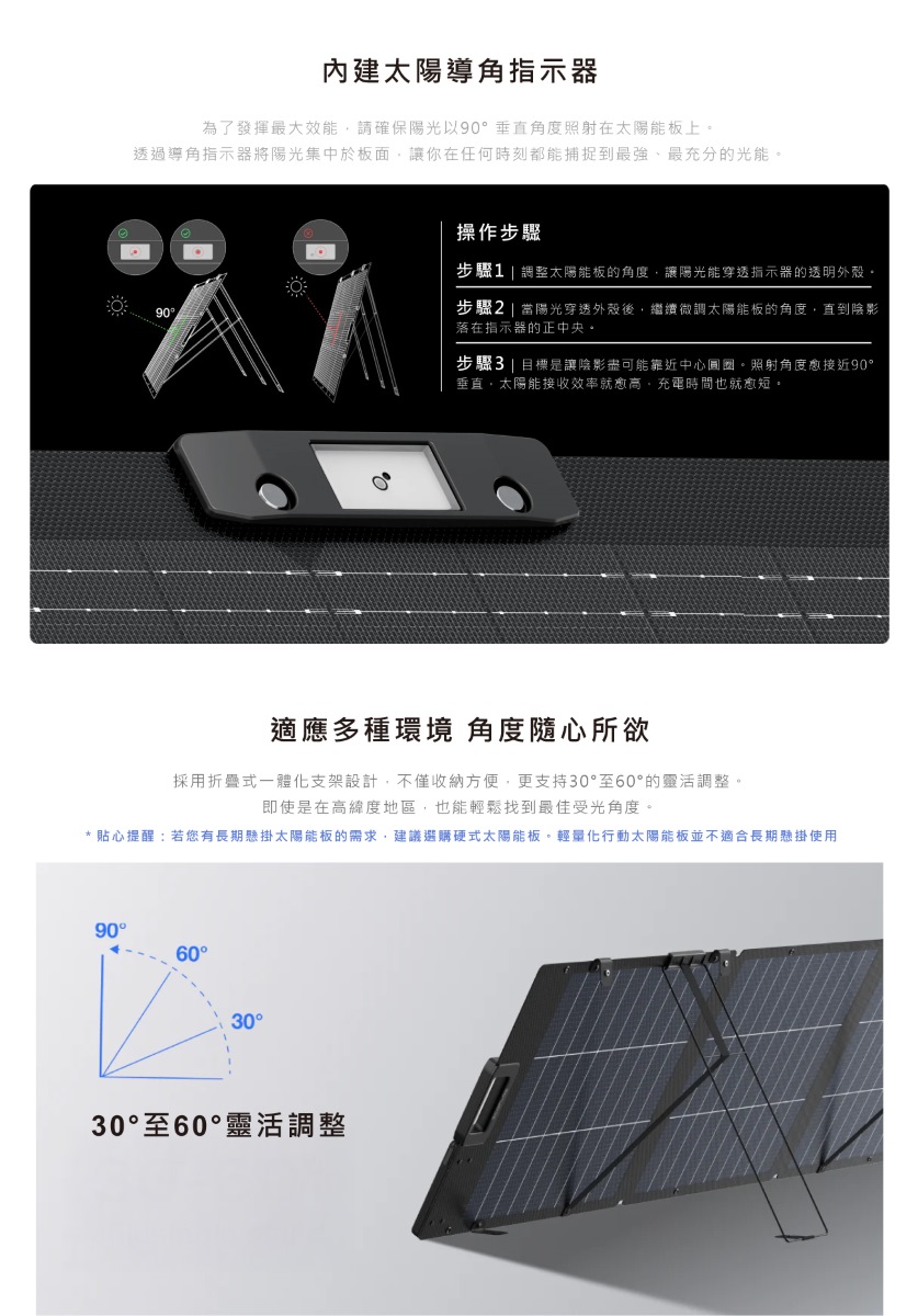 · 高達 25% 的轉換效率· 30-60° 可調節角度支架及內建太陽能角度指南· ETFE 塗層,耐用設計· 輕巧便攜,超級方便攜帶· IP68 等級防護,防水防塵· 配有 XT60 太陽能充電線,適用於 EcoFlow 可攜式太陽能板