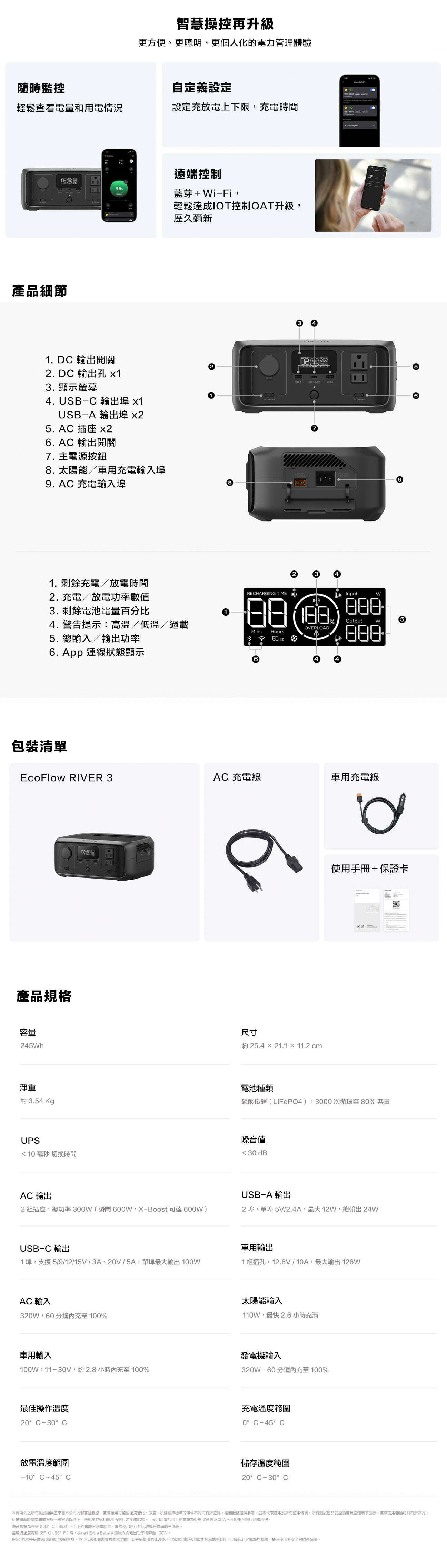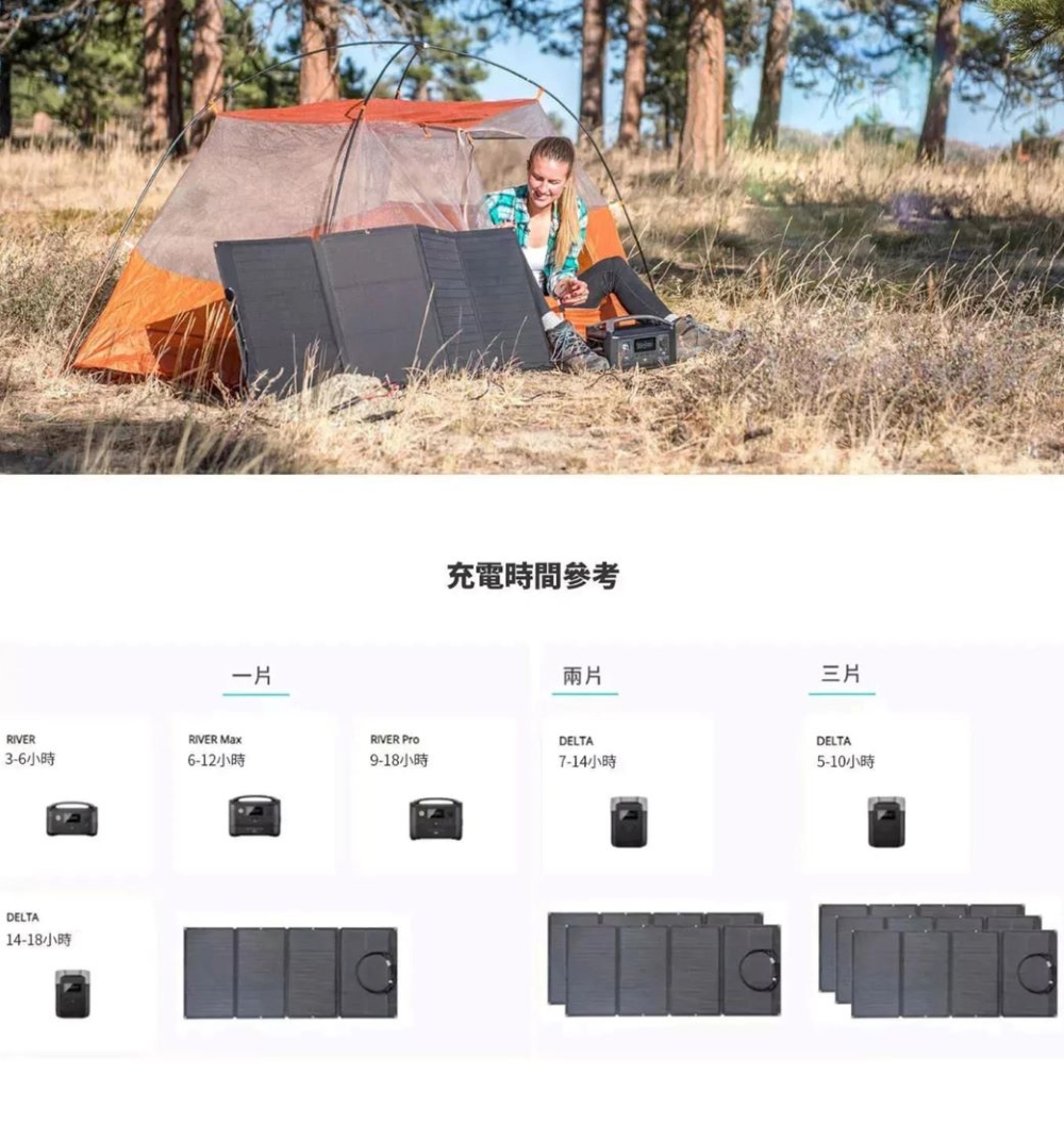 RIVER 3 UPS• 245Wh 電池容量,300W 額定輸出,X-Boost 可達 600W• 低瓦數設備可達 2 倍使用時間(實際使用時間視設備功耗與使用情境而異。)• 比業界平均體積小 30%• 小於 10 毫秒的 UPS 快速切換,提供不中斷備援電力• 小於 30 分貝超靜音運作,全天候安心使用• 1 小時快充,不卡電、不傷電池• IP54 防水等級電池模組,戶外也安心• 最多可同時為 6 台設備供電• 保固二年110W 太陽能板• 由4塊高效單晶矽電池組成• 便攜式和可折疊踢腳板• 設計有橡膠手柄和靈活的支架• EcoFlow 太陽能電池板可使用在0-180度之間調節角度• 耐用防潑水,可承受所有天氣條件,非常適合戶外活動• 保固一年