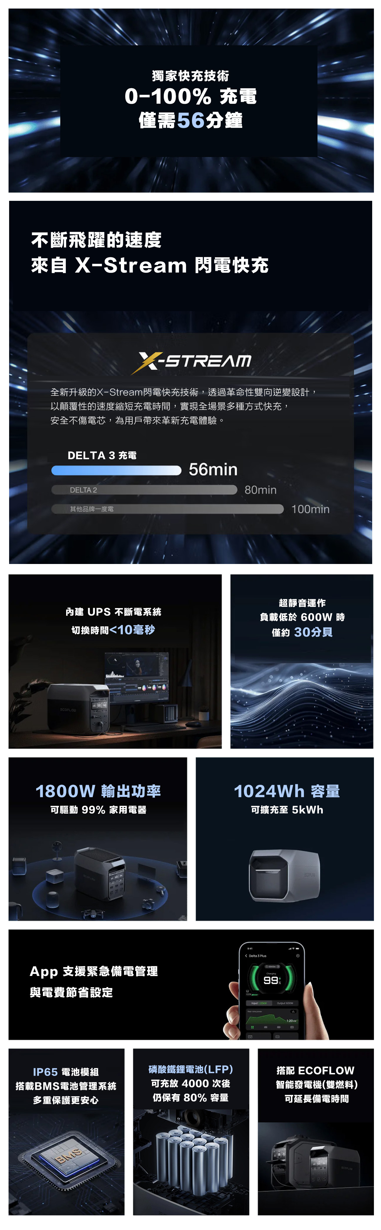 • 支援 5 種快速充電方式:市電、太陽能、800W 車用發電機、3000W 智慧發電機(雙燃料)、多元混合充電