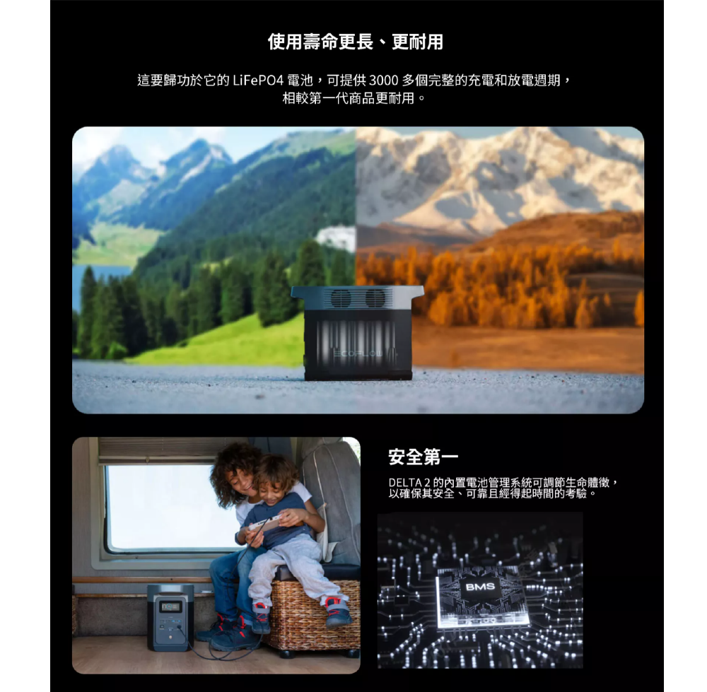 • 電池容量1024Wh,搭配 DELTA 2 額外電池以達到 2048Wh• 可支援 90% 以上的家用電器使用• 15個輸出孔位,支援1800W的高輸出• 獨家 X-Stream 快充技術,僅需50分鐘即可充電至80%• 可透過 EcoFlow App 遠端操控 DELTA 2• 可連接太陽能板高達 500W 的輸入,可在 3 小時內從任何地方快速充電• 配備同樣用於電動汽車的磷酸鐵鋰電池,延長使用年限• 循環使用次數約可達3000次• BSMI認證字號:R3E975(型式EFD330)