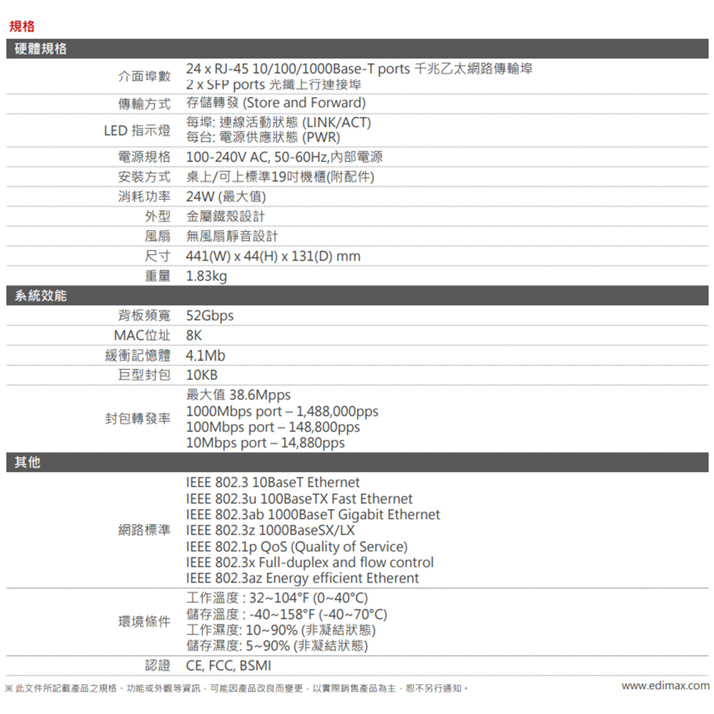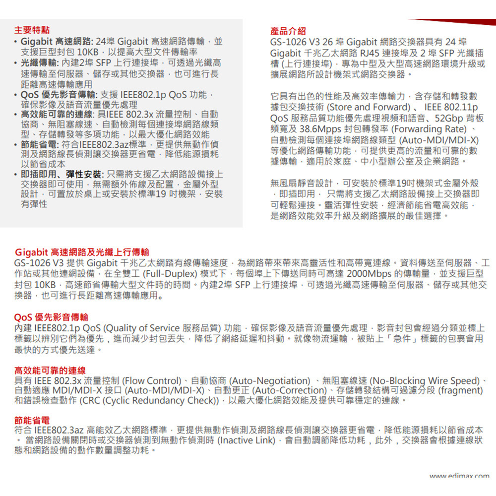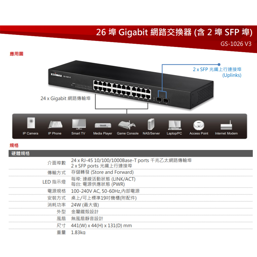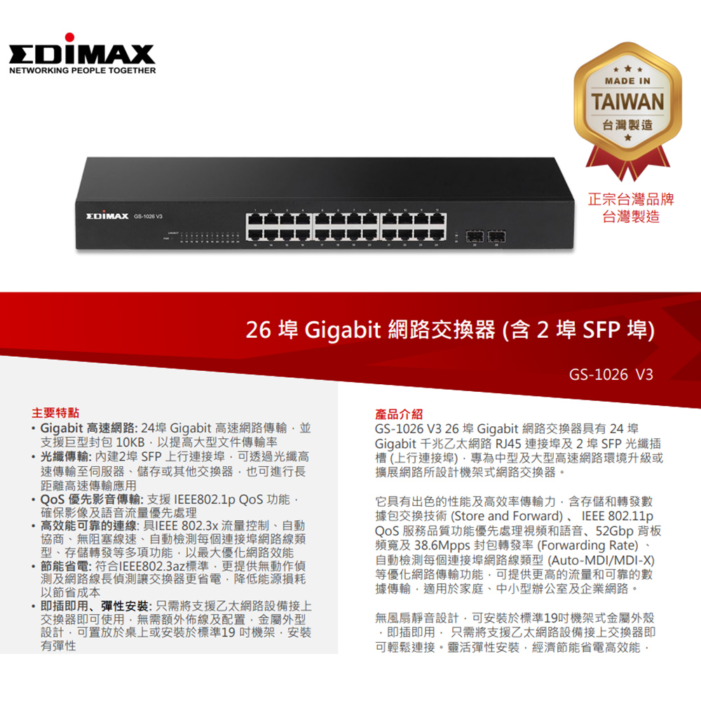 昌運監視器 EDIMAX 訊舟 GS-1026 V3 (MIT) 26埠 Gigabit 網路交換器